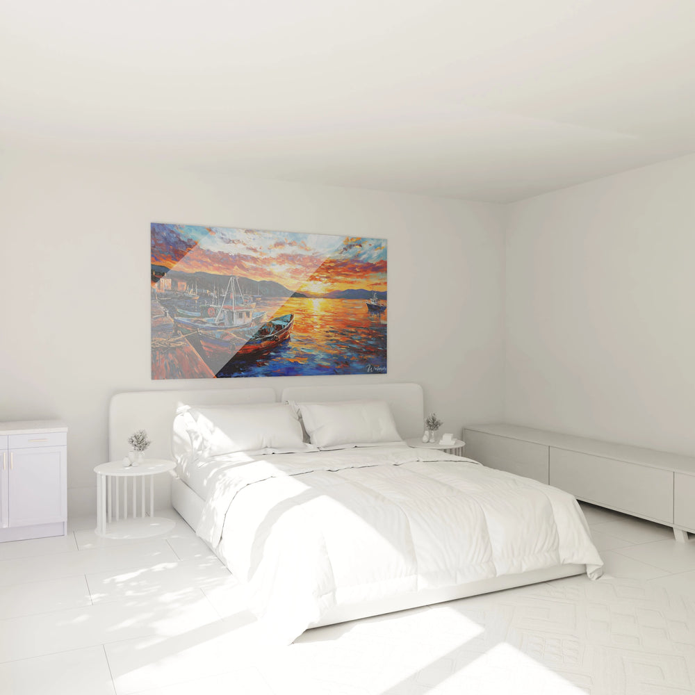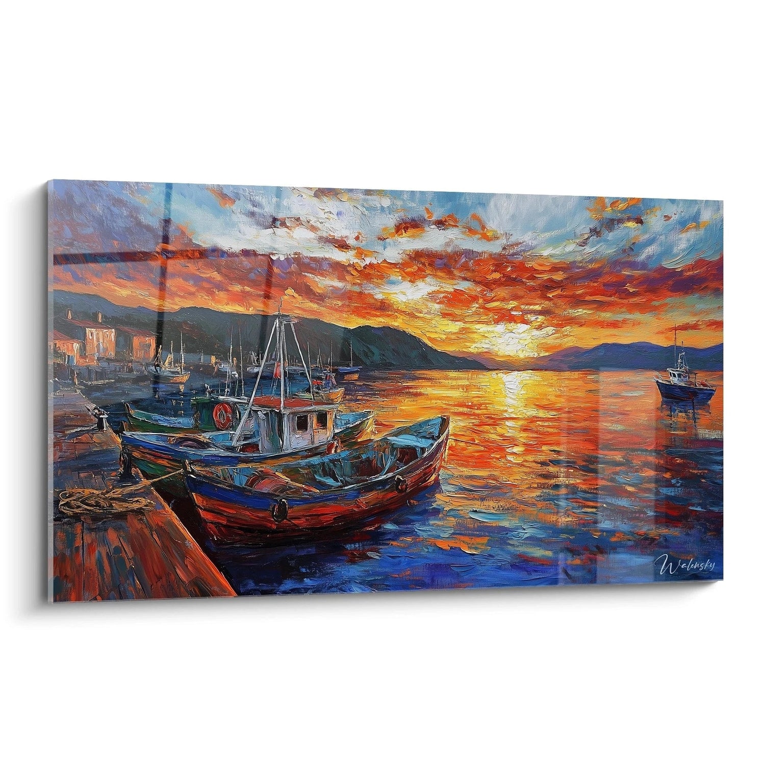 Ce tableau vous transporte dans l’ambiance feutrée d’un port au moment du coucher du soleil. L’harmonie entre la lumière dorée et les ombres marines crée une aura apaisante, invitant à la rêverie et à la contemplation. Chaque bateau amarré semble garder ses secrets : certains reposent, d’autres attendent patiemment leur prochaine aventure. Cette scène invite à sentir le souffle marin, à entendre le clapotis léger de l’eau et à ressentir la douce mélancolie d’un instant unique.