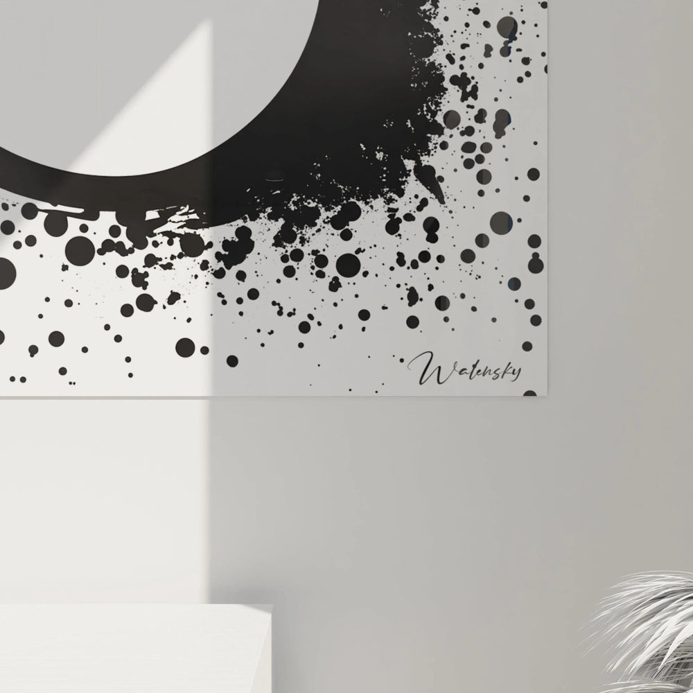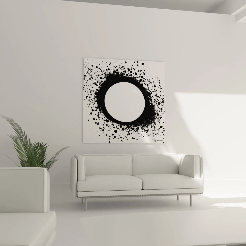 Ce tableau tacheté noir et blanc captive immédiatement par sa composition audacieuse centrée autour d'un cercle parfait. L'œuvre présente un contraste saisissant entre le vide immaculé du centre et l'explosion dynamique de taches noires qui l'entourent. Les projections de différentes tailles créent un motif organique qui semble en perpétuel mouvement, comme figé dans un instant précis. La signature discrète de l'artiste "Webinsky" dans le coin inférieur droit ajoute une touche d'authenticité à cette création minimaliste mais puissante qui allie rigueur géométrique et spontanéité expressive dans un équilibre parfait.