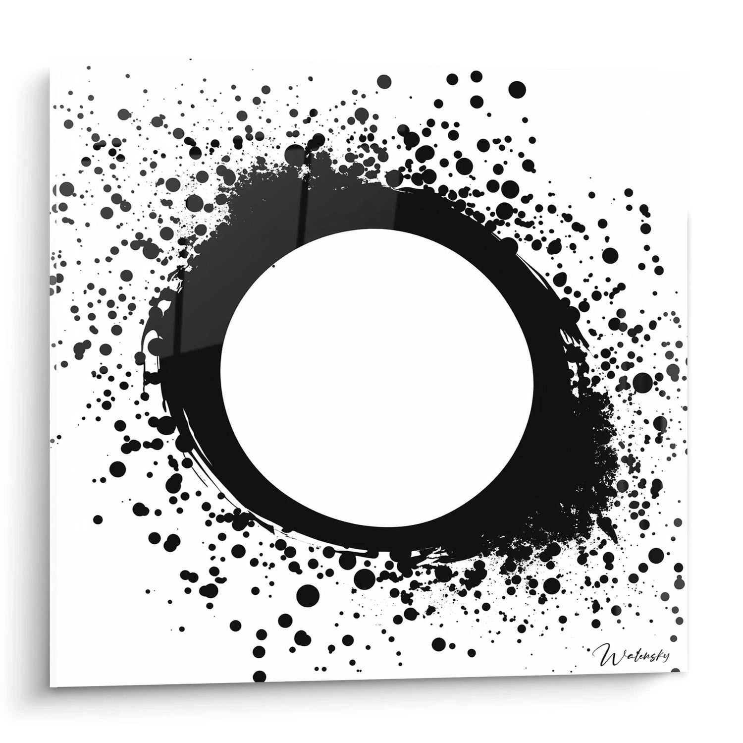 Ce qui distingue particulièrement cette œuvre est la tension parfaitement maîtrisée entre ordre et chaos. Le cercle, symbole géométrique parfait, contraste radicalement avec l'explosion organique et apparemment aléatoire des taches environnantes. Cette dualité visuelle crée une métaphore puissante qui peut évoquer de nombreux concepts : l'ordre émergeant du chaos, l'équilibre entre contrôle et spontanéité, ou encore le vide zen entouré par le tumulte de l'existence.