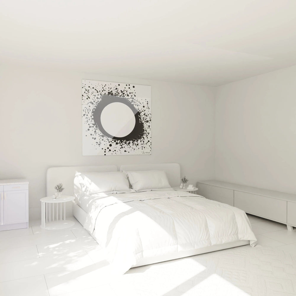 Ce tableau tacheté noir et blanc s'intègre idéalement dans des environnements contemporains aux lignes épurées. Un mur blanc ou gris très clair constitue le fond parfait pour mettre en valeur son contraste saisissant. Les intérieurs minimalistes, industriels ou scandinaves offrent un écrin idéal pour cette œuvre graphique puissante. Évitez les espaces déjà chargés de motifs ou de couleurs vives qui pourraient entrer en compétition visuelle avec la force expressive de cette composition.