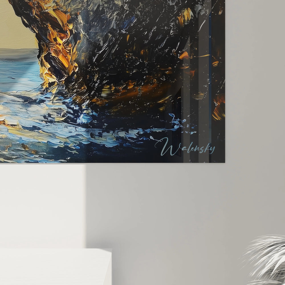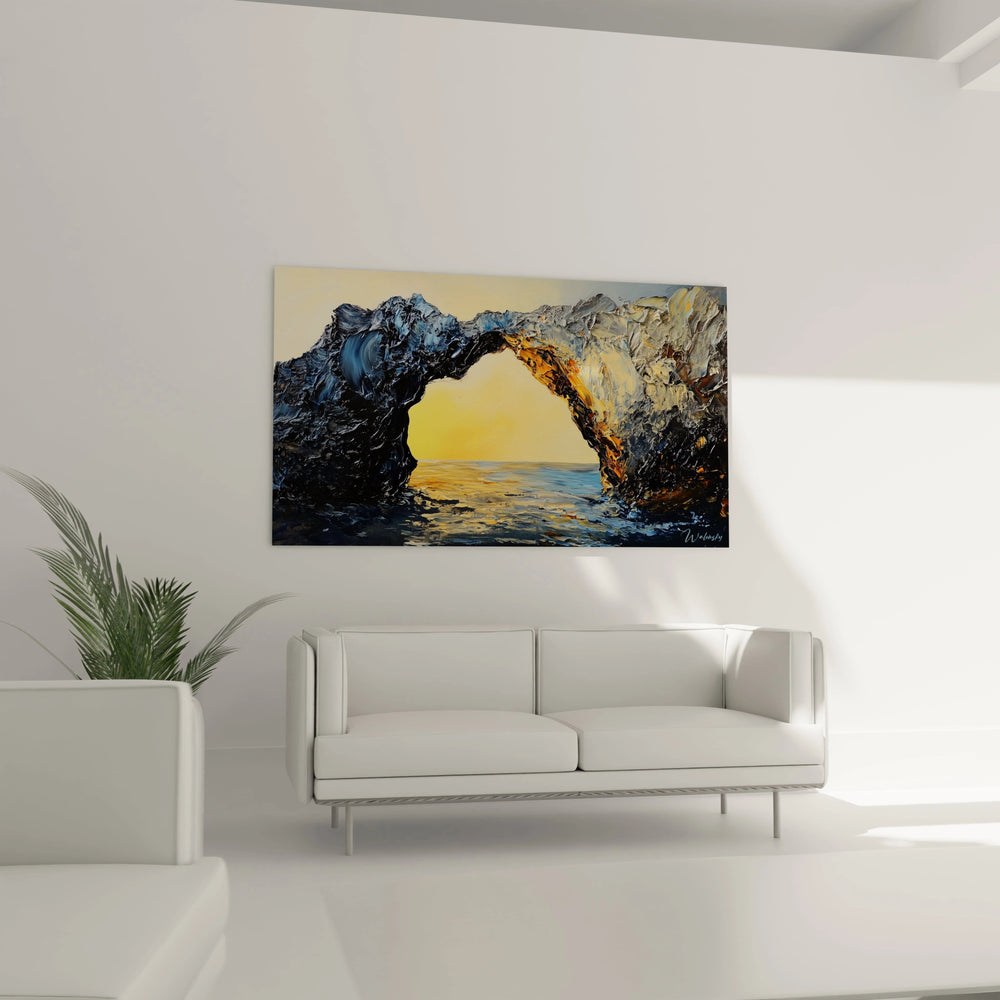 Admirez ce tableau mer représentant une majestueuse arche rocheuse sculptée par l'érosion marine, encadrant un horizon doré au coucher du soleil. La composition captivante révèle une ouverture naturelle formée par des falaises texturées aux teintes sombres qui contrastent dramatiquement avec la lumière ambrée du crépuscule. L'océan scintillant reflète la lueur dorée du ciel, créant une harmonie visuelle saisissante entre les éléments minéraux et aquatiques. La texture tridimensionnelle des empâtements donne vie à cette scène côtière exceptionnelle.
