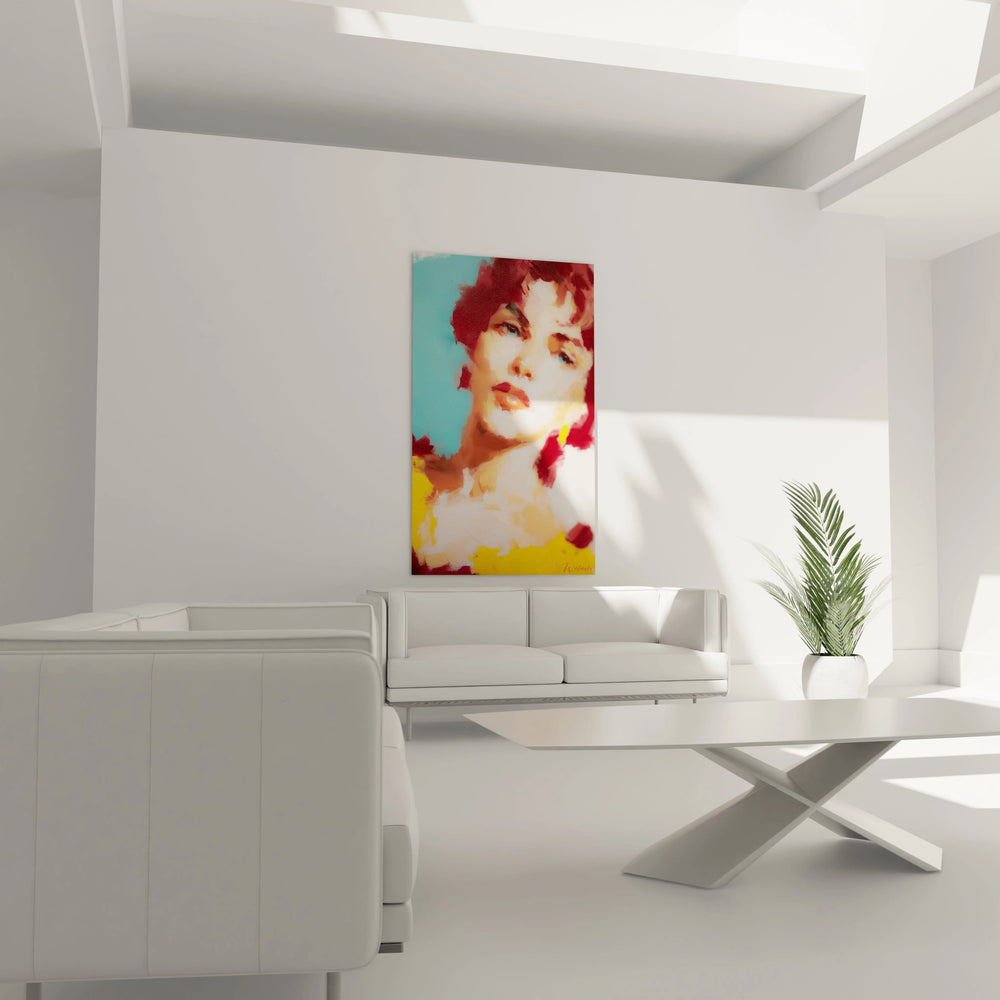 Ce tableau portrait présente une femme au regard captivant, réalisé dans un style impressionniste contemporain. L'œuvre se distingue par sa palette chromatique audacieuse mêlant des tons turquoise profonds et des nuances bordeaux intenses. Le tableau portrait féminin coloré capture l'essence de la beauté moderne à travers des coups de pinceau expressifs et des contrastes saisissants. La chevelure rouge bordeaux encadre délicatement un visage aux traits fins, créant une atmosphère romantique et mystérieuse. Cette décoration murale portrait révèle immédiatement son caractère artistique sophistiqué.