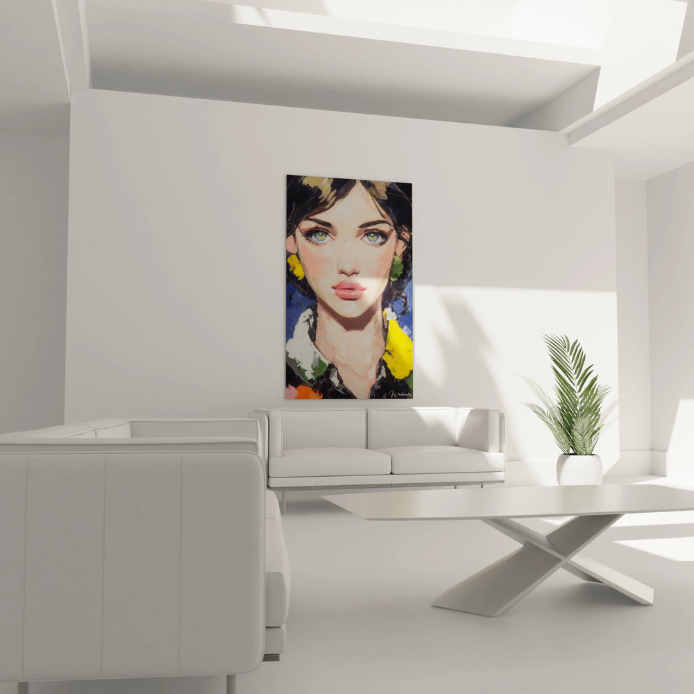 Cette œuvre trouvera naturellement sa place dans un intérieur aux tons neutres où elle pourra déployer toute sa richesse chromatique. Un éclairage LED blanc chaud mettra parfaitement en valeur les nuances de carnation et les accents colorés. L'association avec des éléments décoratifs aux tons dorés ou cuivrés créera des échos harmonieux avec les fleurs jaunes. Cette tableau portrait femme décoration intérieure s'adapte aussi bien aux espaces contemporains qu'aux intérieurs plus classiques. Un mur blanc ou gris perle constituera l'écrin idéal pour cette composition. Cette décoration murale portrait élégant transformera instantanément l'atmosphère d'un salon, d'une chambre ou d'un bureau par son élégance naturelle et son impact visuel maîtrisé.