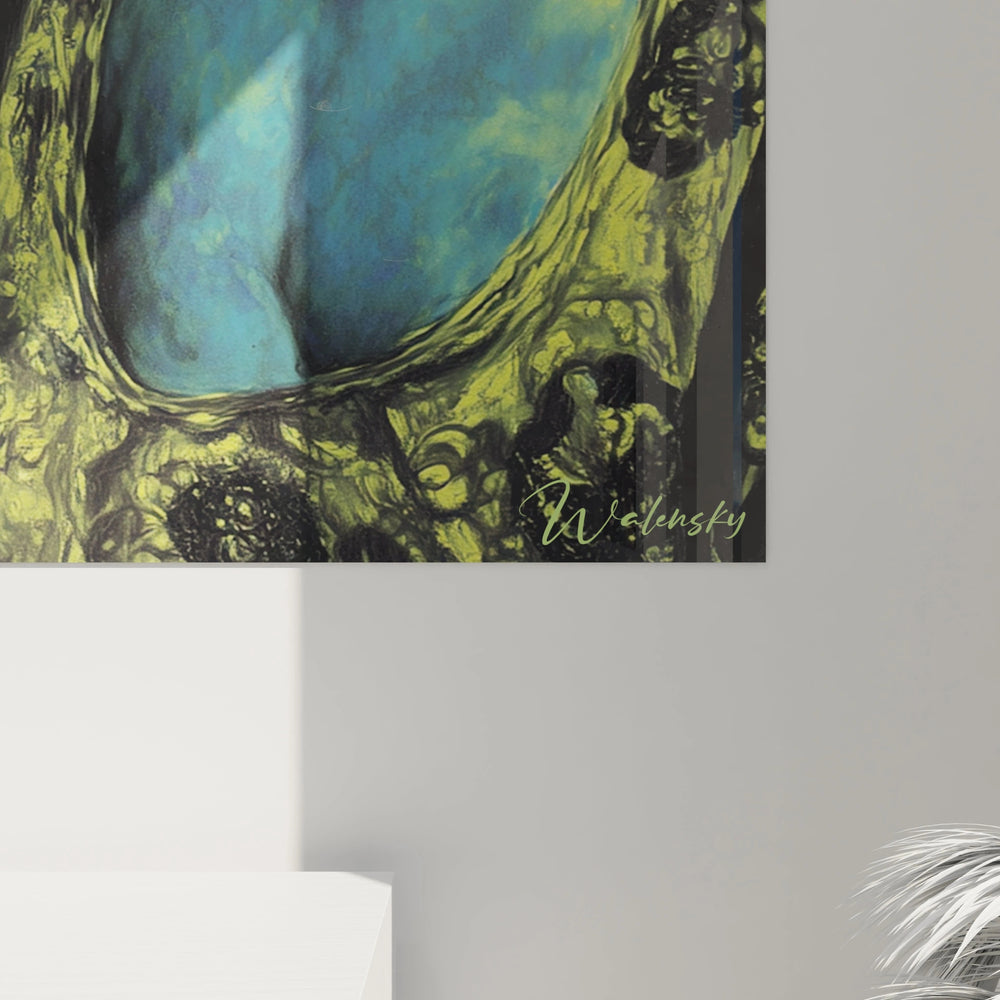 Ce tableau portrait révèle un homme aux traits expressifs, dominé par des tonalités bleu-vert saisissantes qui transforment complètement la perception traditionnelle du genre. La carnation verdâtre, loin d'être naturelle, crée un effet dramatique puissant qui évoque les grands maîtres romantiques. Les cheveux bouclés noirs encadrent un visage aux yeux profonds, créant un contraste saisissant avec la peau aux reflets aquatiques. Cette œuvre présente un tableau portrait romantique d'une intensité rare, où chaque détail contribue à l'atmosphère mystérieuse. L'expression mélancolique du personnage, combinée aux couleurs non-conventionnelles, fait de ce tableau portrait mélancolique une pièce artistique remarquable qui captive immédiatement le regard.