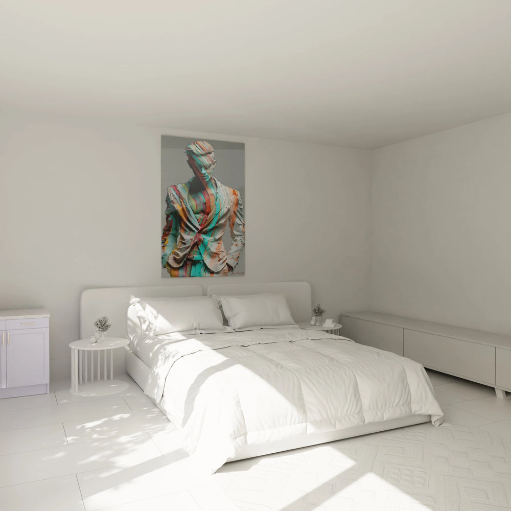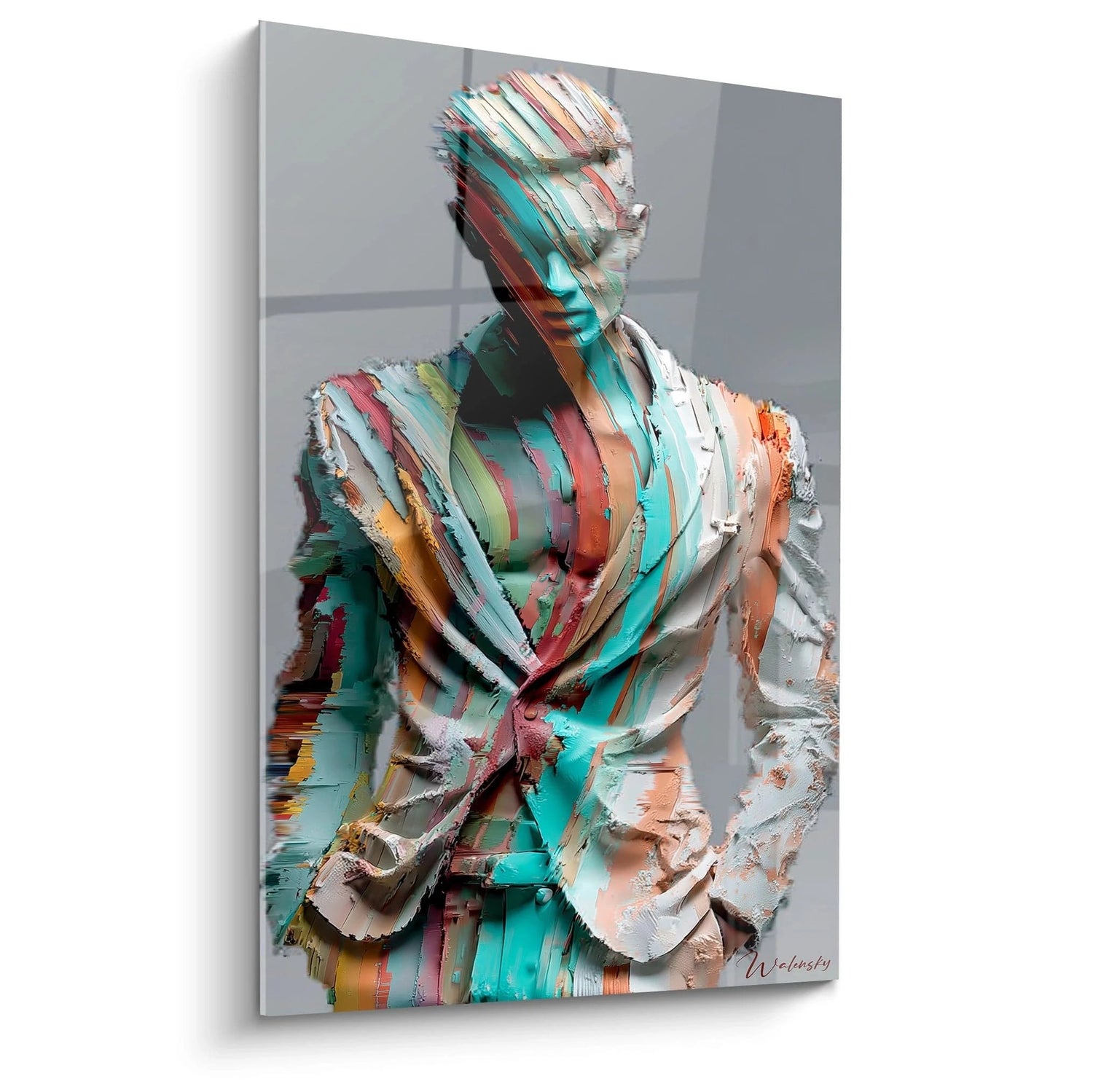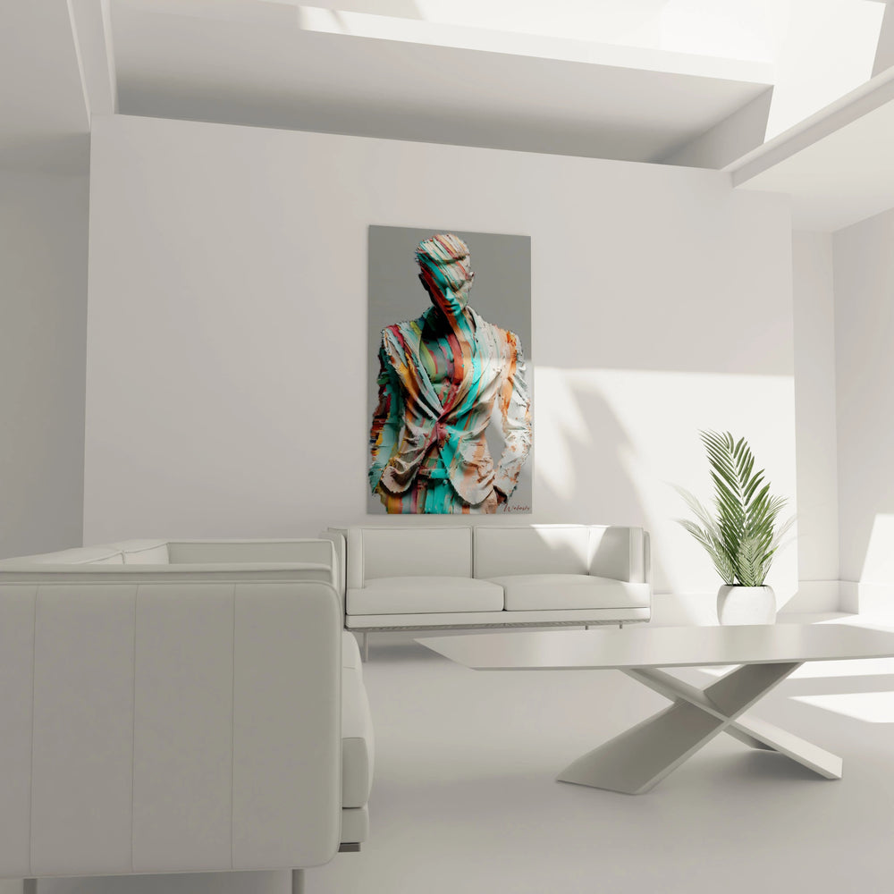 Ce tableau mural masculin révolutionnaire présente un portrait masculin transformé par une technique artistique de fragmentation numérique innovante. L'œuvre capture l'essence de la beauté masculine moderne à travers une approche esthétique unique qui déconstruit et reconstruit simultanément l'image d'un homme contemporain. La technique utilisée, rappelant le pixel sorting ou la glitch art, crée un effet visuel saisissant où le sujet semble émerger d'une cascade de fragments colorés. Les tons dominants - turquoise électrique, orange chaleureux, blanc pur et accents de rouge et vert - forment une palette contemporaine qui sublime la figure masculine. Cette représentation artistique masculine transcende le portrait traditionnel pour offrir une vision moderne de l'identité masculine, où la beauté se révèle dans la fragmentation contrôlée. L'arrière-plan gris neutre permet aux éclats de couleur de ressortir avec intensité, créant un contraste dramatique qui accentue l'impact visuel de l'œuvre. Cette pièce murale contemporaine s'inscrit dans une démarche artistique contemporaine qui questionne les codes esthétiques traditionnels tout en célébrant la masculinité moderne sous un angle nouveau et raffiné. Ce tableau décoratif masculin trouve parfaitement sa place dans les intérieurs masculins contemporains.