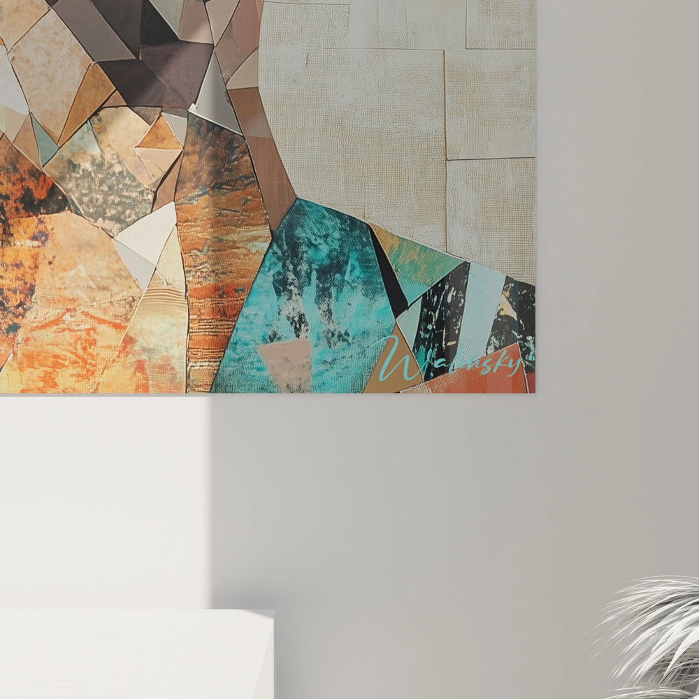 La palette chromatique de ce tableau portrait multicolore révèle une maîtrise exceptionnelle des harmonies colorées. Les tons dominants oscillent entre les bleus turquoise profonds, les oranges chaleureux et les ocres terreux qui se mélangent harmonieusement. Cette décoration murale portrait exploite les contrastes complémentaires entre les teintes froides et chaudes pour créer une dynamique visuelle captivante. Les nuances de rouge vermillon des lèvres contrastent magnifiquement avec les tons poudrés de la peau, tandis que les fragments bleus apportent une fraîcheur moderne à l'ensemble.