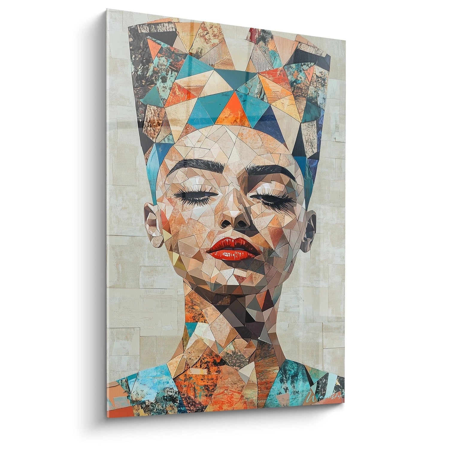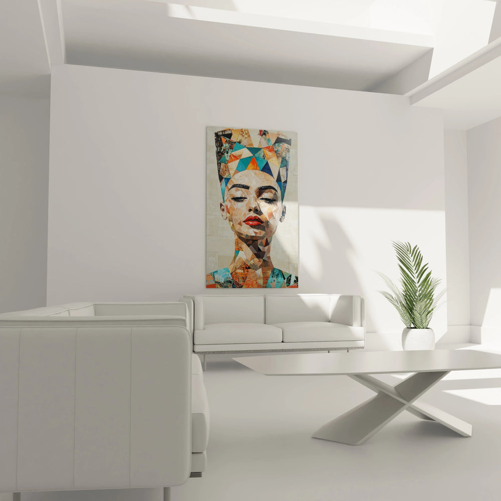 L'unicité de ce tableau portrait réside dans sa capacité à maintenir l'émotion humaine malgré la fragmentation géométrique radicale. Chaque détail contribue à une œuvre portrait impossible à dupliquer : la courbe spécifique des cils, l'inclinaison particulière de la tête, et surtout cette expression de sérénité qui transparaît à travers les fragments colorés. Les caractéristiques spécifiques incluent cette technique de polygonisation qui respecte parfaitement l'anatomie du visage tout en la réinventant. Cette décoration murale contemporaine se distingue par son approche novatrice qui transforme un portrait classique en une œuvre d'art moderne sans perdre l'essence humaine du sujet représenté.