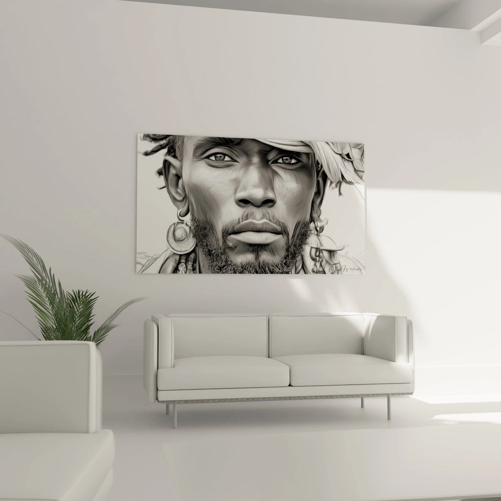 L'unicité de cette art mural portrait ethnique africain réside dans la combinaison harmonieuse entre modernité technique et authenticité culturelle. Les ornements traditionnels, notamment les imposantes boucles d'oreilles circulaires et les détails gravés, ancrent fermement l'œuvre dans un héritage culturel spécifique. L'expression faciale, mélange de fierté, de sagesse et de sérénité, capture l'essence même de la dignité africaine. Les proportions parfaites du visage, les détails anatomiques précis et l'intensité du regard créent une présence magnétique impossible à reproduire. Cette œuvre portrait masculin africain authentique transcende la simple représentation pour devenir un témoignage artistique puissant.