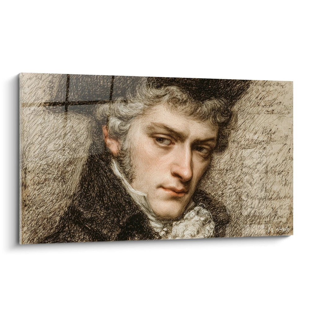 Cette décoration murale portrait unique se distingue par plusieurs éléments visuels remarquables qui en font une œuvre d'exception. L'expression du modèle constitue l'élément le plus frappant : son regard légèrement voilé et sa bouche aux commissures délicatement abaissées traduisent une mélancolie touchante. La coiffure aux boucles naturelles, caractéristique d'une époque révolue, ajoute un charme aristocratique indéniable. Les détails du col blanc, finement plissé et visible au bas du portrait, témoignent du raffinement vestimentaire du personnage. Cette art mural homme romantique capture un instant de rêverie qui transcende les siècles, créant une connexion émotionnelle immédiate avec l'observateur moderne.