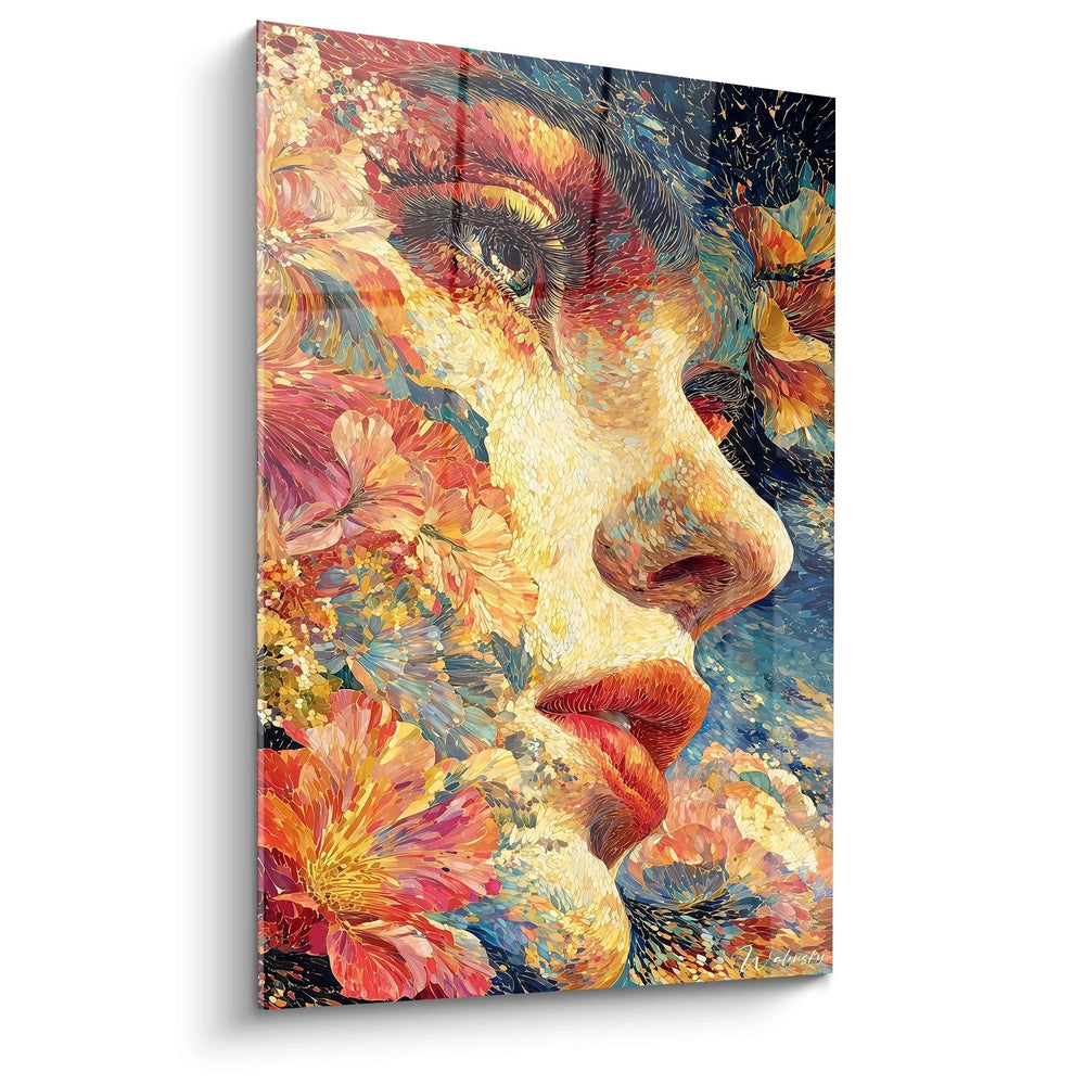 Ce tableau portrait féminin contemporain se distingue par plusieurs éléments impossibles à dupliquer. La fusion parfaite entre réalisme du portrait et stylisation florale crée une signature artistique reconnaissable. L'originalité réside dans cette capacité à maintenir l'expressivité du regard tout en décomposant l'image en milliers de touches colorées. Les caractéristiques spécifiques incluent cette technique de fragmentation qui ne nuit jamais à la lisibilité du sujet. Cette art mural portrait féminin possède également cette qualité rare de changer d'aspect selon la distance d'observation, révélant tantôt les détails techniques, tantôt l'émotion globale. L'intégration des fleurs tropicales n'est pas décorative mais structurelle, participant pleinement à la composition.