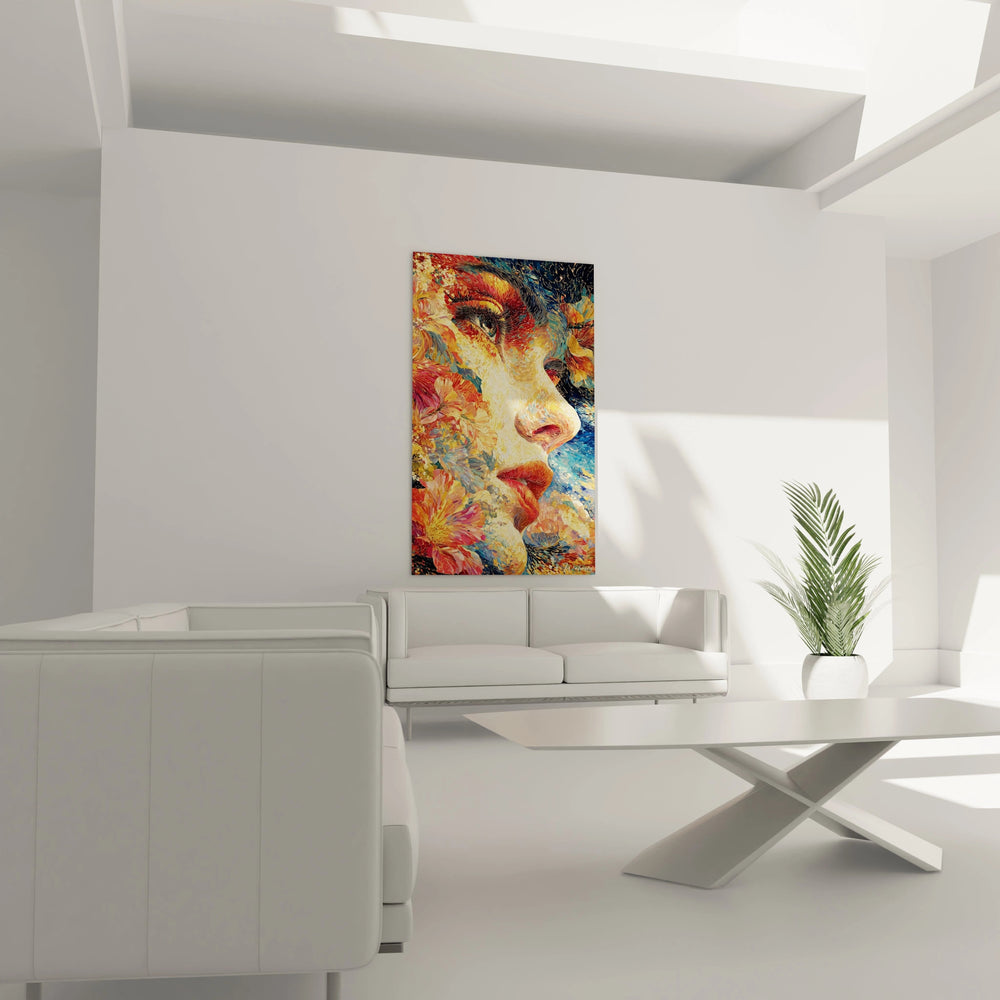 Cette décoration murale portrait féminin tire sa force émotionnelle de contrastes chromatiques audacieux entre les tons chauds et froids. Les nuances se fondent harmonieusement grâce à la technique de fragmentation, créant des transitions subtiles qui donnent vie à l'ensemble. L'impact psychologique de ces choix colorés évoque à la fois la passion et la sérénité.