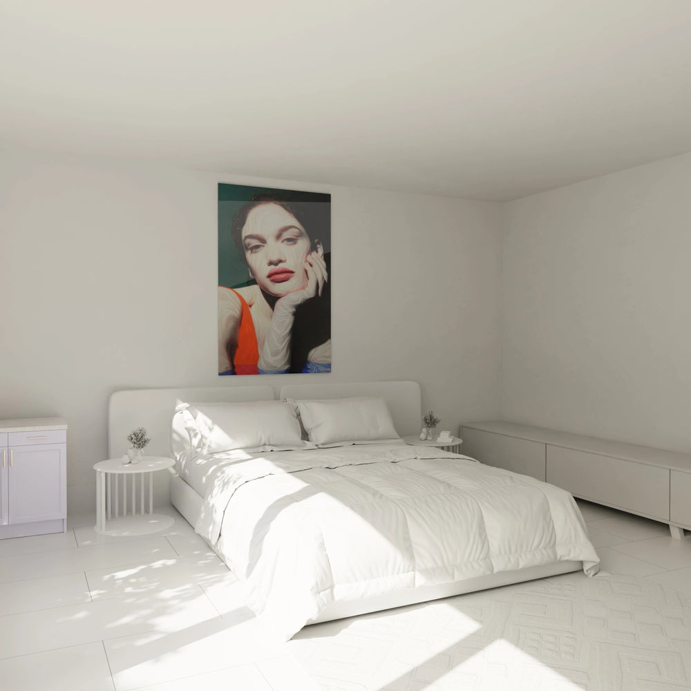 Cette décoration murale portrait féminin unique se distingue par plusieurs caractéristiques exceptionnelles. L'expression du modèle oscille entre mélancolie et sérénité, créant une ambiguïté émotionnelle captivante. La gestuelle de la main, ni complètement posée ni totalement suspendue, suggère un mouvement figé dans l'instant. L'angle de vue légèrement décalé rompt avec les codes traditionnels du portrait frontal. La signature stylisée dans le coin inférieur droit témoigne de l'identité artistique assumée. Ce tableau portrait féminin émotionnel transcende la simple représentation pour devenir une fenêtre sur l'âme humaine, caractéristique unique de l'hyperréalisme contemporain.