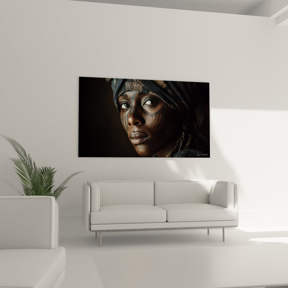 Ce tableau mural portrait africain présente une représentation saisissante d'une femme africaine aux traits expressifs et au regard perçant. L'œuvre met en scène un visage féminin africain orné de peintures corporelles tribales traditionnelles, avec des motifs géométriques délicats qui soulignent la beauté naturelle du modèle. Les yeux blancs mystiques créent un contraste dramatique avec la peau aux reflets cuivrés, conférant à l'ensemble une dimension spirituelle profonde. Le tableau décoratif ethnique capture l'essence de l'art corporel ancestral à travers des lignes noires qui dessinent des motifs symboliques sur le visage et le corps. La coiffure traditionnelle, composée de tissus colorés aux motifs dorés, encadre harmonieusement le portrait et renforce l'authenticité culturelle de la représentation. Cette œuvre d'art africain contemporain allie technique photographique moderne et esthétique traditionnelle, créant un tableau portrait ethnique moderne qui célèbre la richesse de l'héritage culturel africain tout en s'inscrivant dans une démarche artistique contemporaine.
