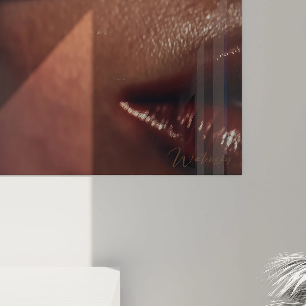 La technique d'éclairage dramatique employée révèle avec finesse les contours du visage féminin, mettant particulièrement en valeur la sensualité des lèvres et la douceur de la peau. L'artiste a su maîtriser l'art du clair-obscur, créant des zones d'ombres et de lumières qui confèrent une dimension sculpturale au portrait. Cette approche esthétique rappelle les grands maîtres de la peinture, tout en adoptant une modernité photographique contemporaine.