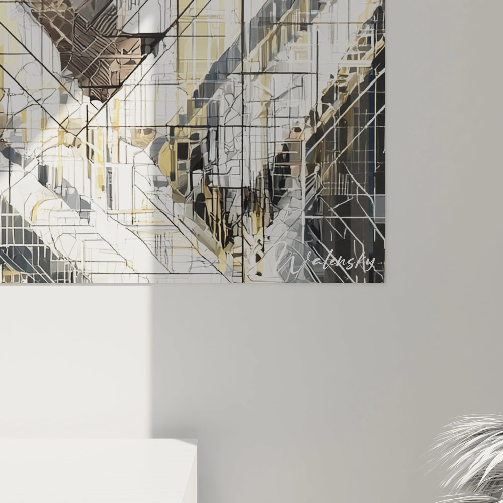 La symbolique de cette œuvre repose sur la fusion entre l'humain et l'architecture urbaine moderne. Le portrait féminin doré représente la beauté intemporelle et la grâce, tandis que les éléments géométriques évoquent la modernité et le dynamisme urbain. Les tons dorés symbolisent le luxe, la richesse et la sophistication, créant un contraste saisissant avec les nuances de gris et de noir qui apportent profondeur et mystère. Cette palette chromatique raffinée confère à l'ensemble une esthétique luxueuse parfaitement adaptée aux intérieurs contemporains haut de gamme.