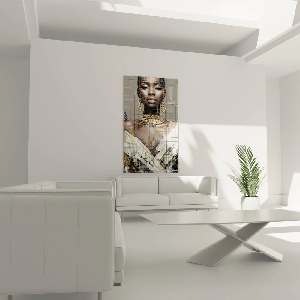 beauté afro-américaine, art numérique luxe, portrait géométrique, décoration murale haute couture, art urbain sophistiqué
