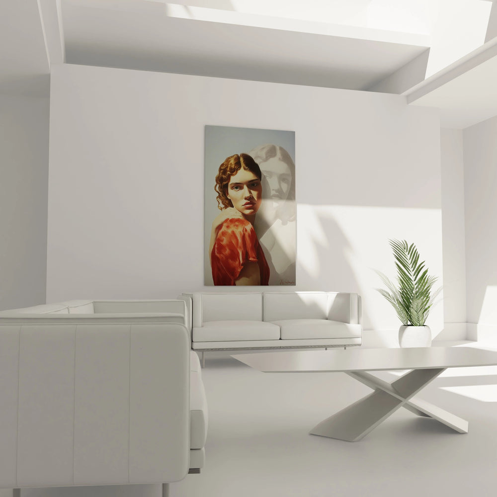 Ce tableau portrait femme révèle une composition saisissante où une jeune femme aux cheveux bouclés dorés se détache avec élégance sur un arrière-plan dominé par une sculpture classique. L'œuvre présente un contraste fascinant entre la vivacité du modèle contemporain et la solennité de l'art statuaire antique. Cette décoration murale portrait moderne capture instantanément l'attention par son jeu subtil entre réalisme contemporain et références classiques. L'expression pensive du modèle, tournée vers l'observateur, crée une connexion immédiate et intense. Les détails minutieux des traits du visage démontrent une maîtrise technique remarquable, particulièrement visible dans le rendu des yeux expressifs et de la texture naturelle de la peau.