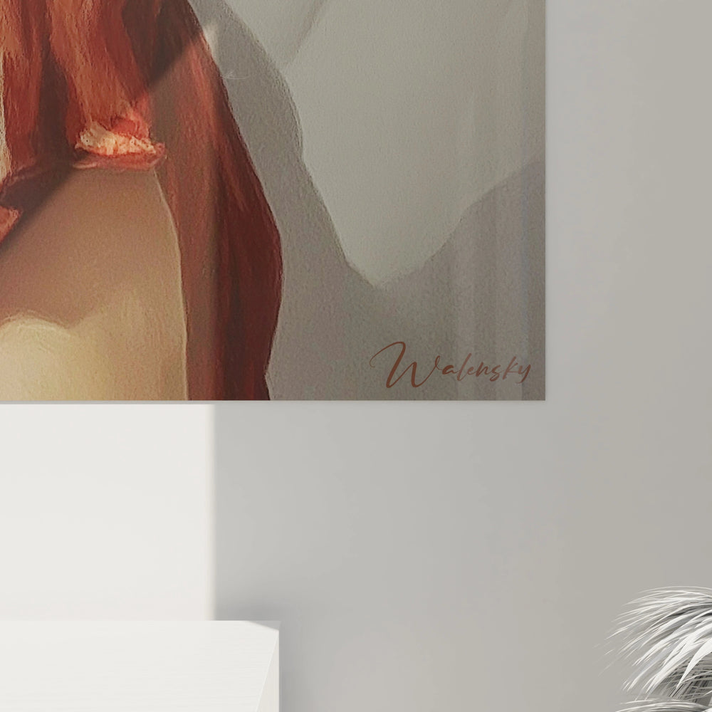 La palette chromatique révèle une sophistication remarquable dans l'utilisation des tons chauds et froids. Les nuances dorées des cheveux bouclés créent un éclat lumineux qui contraste magnifiquement avec les tons plus neutres de l'arrière-plan. Cette décoration murale tons chauds exploite particulièrement le rouge vermillon du vêtement comme couleur d'accent principale.