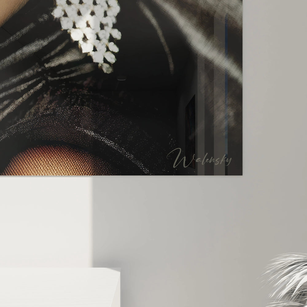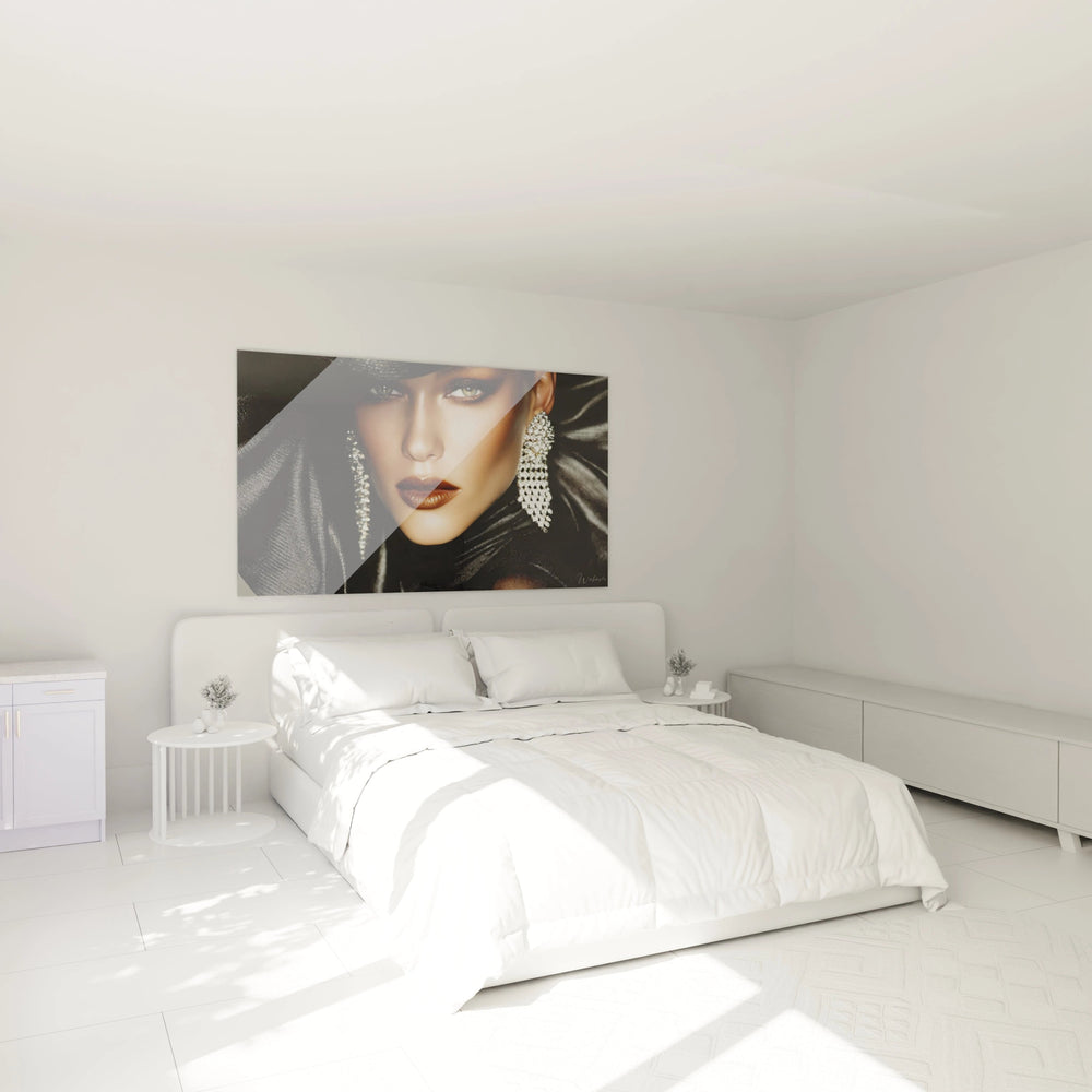 Cette œuvre s'inscrit dans la tradition du portrait de mode contemporain, rappelant les travaux de photographes de renom comme Helmut Newton ou Richard Avedon. L'approche dramatique de l'éclairage évoque également les portraits glamour Hollywood vintage des années 1940-1950, notamment ceux immortalisés par George Hurrell. La sophistication du styling et l'attention portée aux accessoires de luxe haute joaillerie font écho aux campagnes publicitaires de haute joaillerie contemporaines. L'esthétique générale rappelle également certaines œuvres de pop art moderne où le portrait photographique est sublimé et transformé en décoration murale artistique. Cette fusion entre photographie de mode et art mural s'inscrit dans une démarche artistique contemporaine qui valorise l'image de la femme moderne élégante.