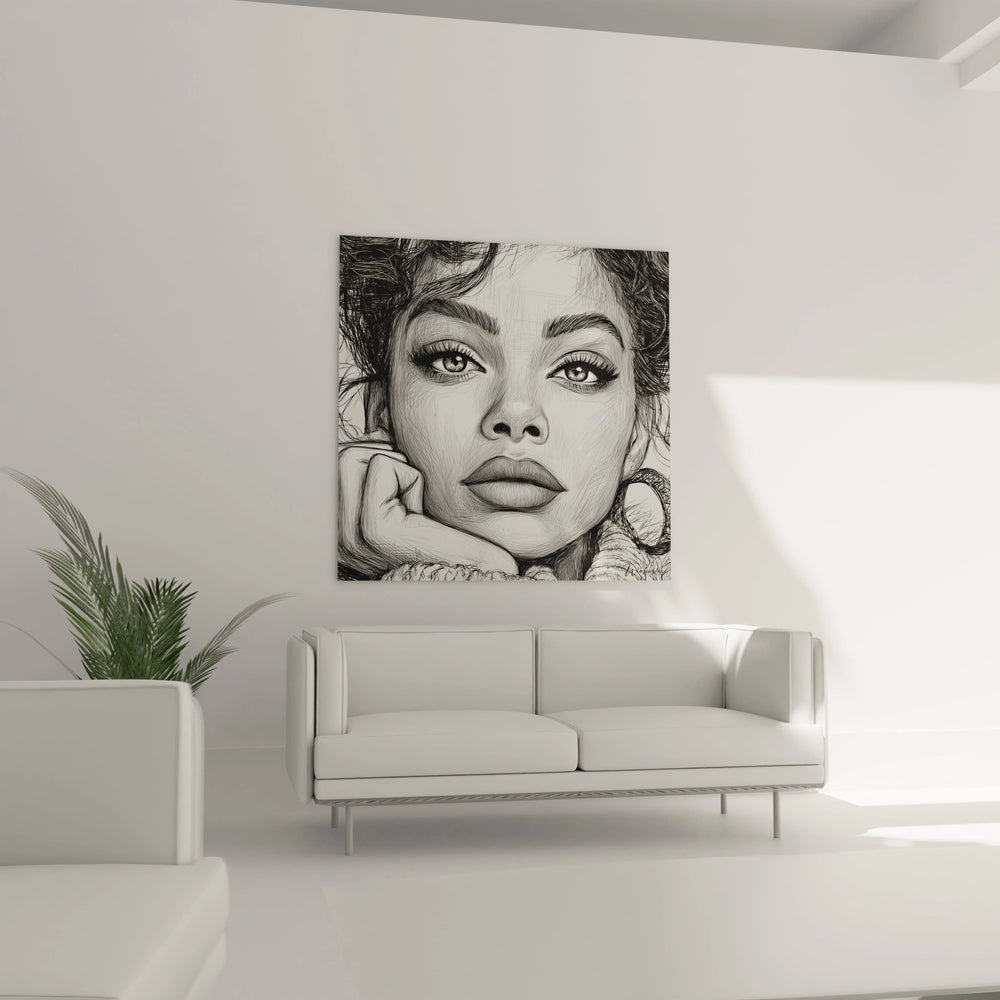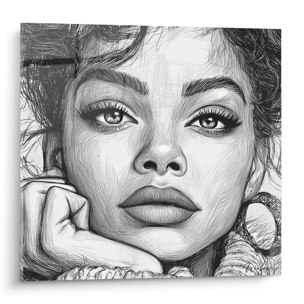 Ce tableau mural portrait femme présente une illustration remarquable en noir et blanc, réalisée dans un style graphique contemporain qui évoque l'univers de l'illustration de mode. L'œuvre met en scène le visage d'une femme aux traits délicats, capturé dans un cadrage intimiste qui révèle toute la finesse du travail artistique. La technique employée, mêlant hachures croisées et traits fins, crée un rendu visuel d'une grande richesse texturelle. Les yeux, véritables points focaux de la composition, sont traités avec un soin particulier : les cils prononcés et le regard direct confèrent à l'ensemble une intensité émotionnelle saisissante. Les cheveux ondulés, représentés par des traits fluides et dynamiques, encadrent harmonieusement le visage et apportent un mouvement naturel à la composition. Les mains, délicatement positionnées près du menton, ajoutent une dimension contemplative et élégante au portrait. Cette illustration mode noir et blanc témoigne d'une maîtrise technique exceptionnelle, où chaque détail contribue à créer une œuvre d'une beauté graphique indéniable. Le style artistique combine parfaitement réalisme et stylisation, créant un équilibre visuel qui séduit par son raffinement et sa modernité. Ce tableau mural décoratif s'intègre parfaitement dans les intérieurs contemporains recherchant une décoration murale élégante.