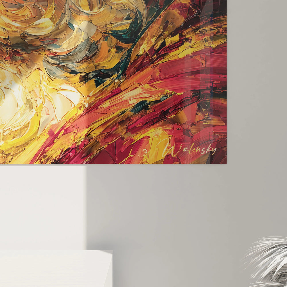 La palette chromatique de ce tableau portrait couleurs chaudes s'articule autour d'une dominante orangée et dorée, ponctuée de rouge vif et de touches sombres profondes. Ces couleurs chaudes créent une atmosphère chaleureuse et passionnée, évoquant le feu intérieur et la créativité. Les contrastes entre les zones lumineuses dorées et les ombres brunes créent un relief saisissant qui sculpte littéralement le visage. Cette art mural portrait utilise également des nuances plus froides, notamment des verts sombres et des bleus profonds, qui apportent une profondeur et un équilibre à l'ensemble.