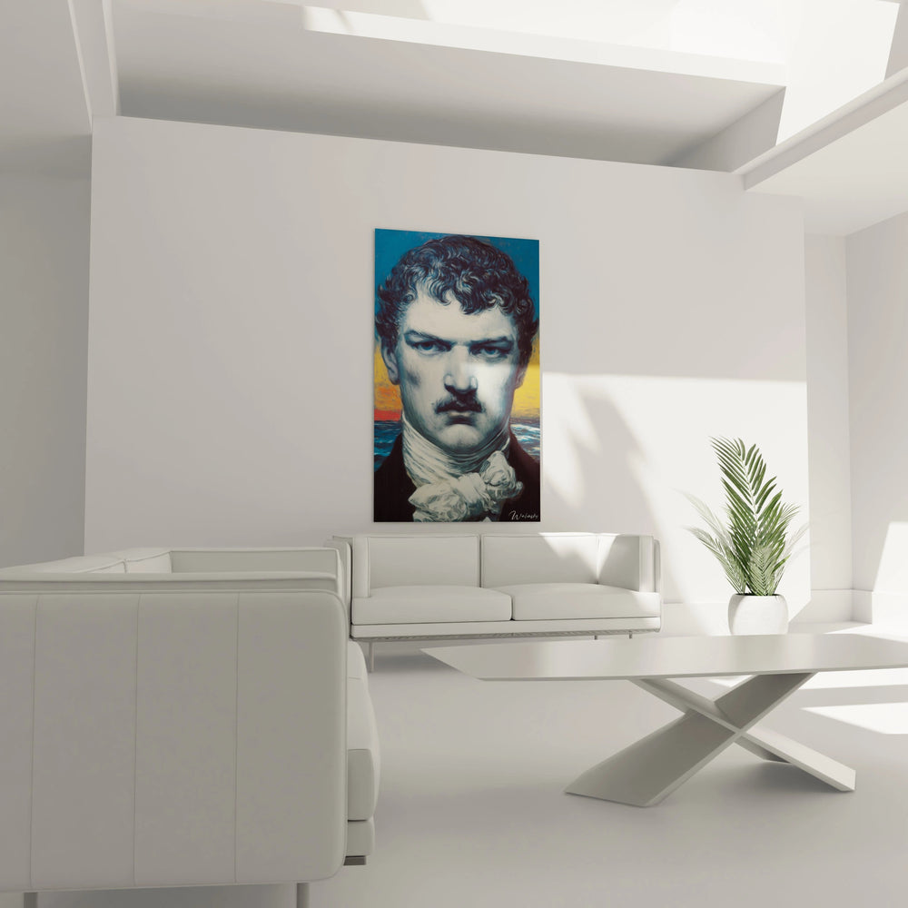 Ce tableau portrait masculin révèle un personnage aux traits expressifs et à la présence magnétique. L'œuvre présente un homme aux cheveux bouclés d'un noir profond, dont le regard intense captive immédiatement l'observateur. La composition frontale du tableau portrait homme romantique met l'accent sur l'expression faciale particulièrement saisissante. Le sujet porte une cravate blanche élégante qui contraste harmonieusement avec sa veste sombre. L'arrière-plan coloré mélange des teintes bleues océaniques et des nuances dorées chaudes, créant une atmosphère à la fois mystérieuse et sophistiquée. Cette décoration murale portrait se distingue par son traitement pictural raffiné et son impact émotionnel immédiat.