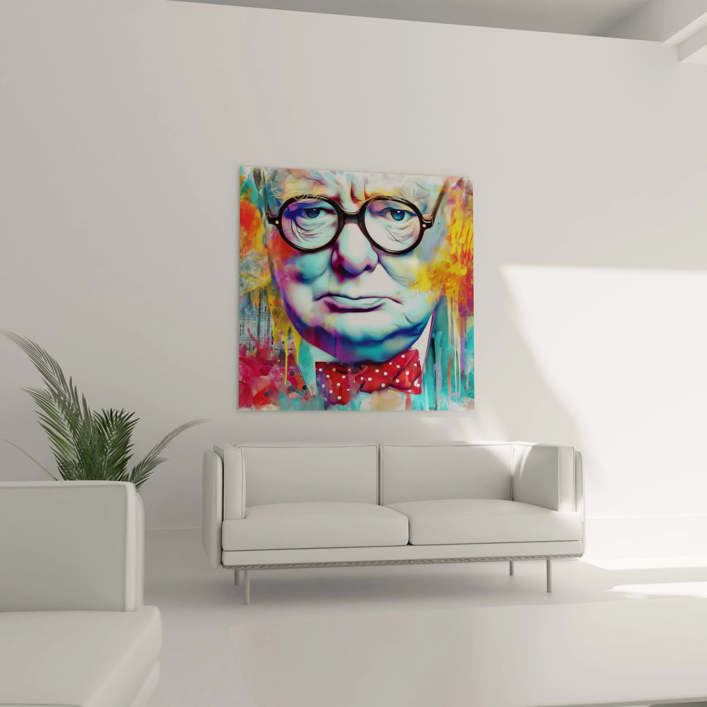 Les textures visibles sur ce tableau portrait numérique révèlent une maîtrise technique remarquable. Les surfaces alternent entre des zones lisses aux dégradés parfaits et des zones plus texturées imitant les éclaboussures de peinture. Les effets de lumière créent des reflets naturels sur les lunettes, contrastant avec les jeux d'ombres colorées sur le visage. La technique artistique identifiable combine l'art numérique et l'esthétique de la peinture traditionnelle. Les détails minutieux, comme les rides d'expression et la texture des cheveux, restent perceptibles malgré la stylisation colorée, témoignant d'un équilibre parfait entre réalisme et abstraction.