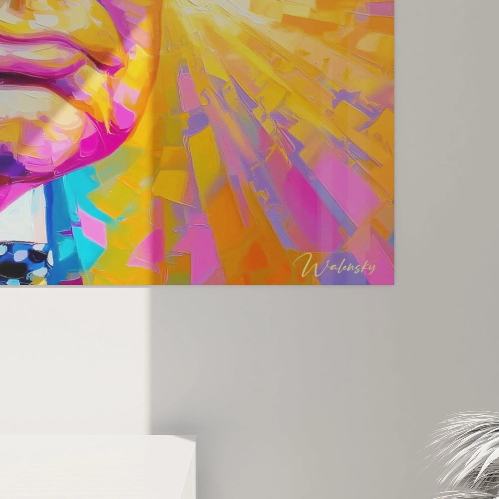 L'unicité de cette décoration murale portrait unique réside dans sa capacité à transformer un sujet classique en expression contemporaine audacieuse. Les caractéristiques spécifiques incluent l'utilisation non-naturaliste de la couleur qui crée une identité visuelle impossible à reproduire exactement. Le traitement géométrique des formes faciales, avec des facettes colorées distinctes, constitue un aspect visuel remarquable. L'intensité du regard bleu, préservé dans sa couleur naturelle, contraste avec l'environnement chromatique fantaisiste. Cette œuvre portrait moderne se distingue par son équilibre entre figuration reconnaissable et abstraction colorée. Les aspects visuels remarquables incluent la signature artistique intégrée et l'harmonie globale malgré la complexité chromatique. Cette approche unique positionne l'œuvre dans une esthétique contemporaine assumée.