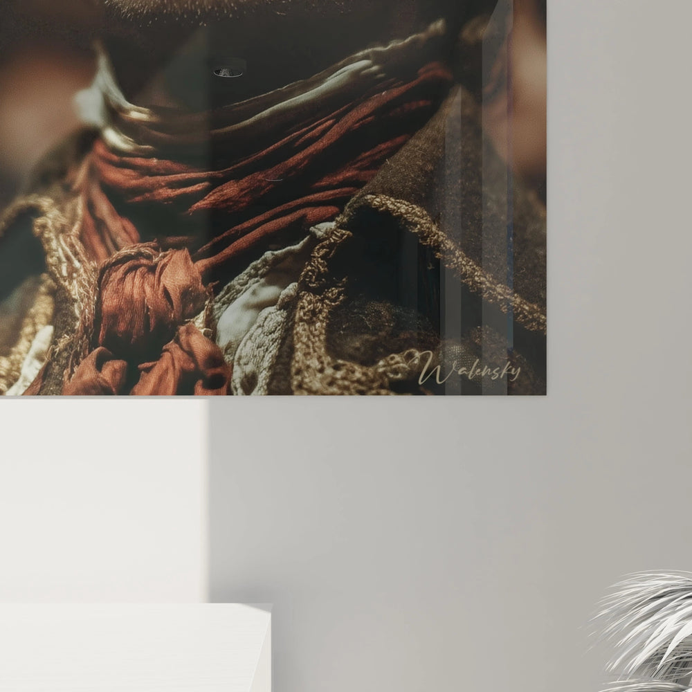Cette décoration murale portrait chaleureux exploite les contrastes subtils entre les zones éclairées et les passages plus sombres. L'impact émotionnel de ces choix chromatiques évoque la sérénité et la profondeur, créant une atmosphère propice à la contemplation dans ce tableau portrait ambiance feutrée.