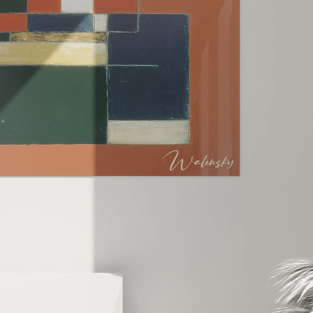 Ce tableau portrait constructiviste présente une représentation géométrique saisissante d'un homme, décomposé en formes architecturales précises. L'œuvre révèle immédiatement son appartenance au mouvement constructiviste par sa structure en blocs colorés et ses lignes nettes. Le tableau portrait géométrique moderniste captive par sa synthèse entre représentation humaine et abstraction industrielle. Les formes rectangulaires et carrées dominent la composition, créant un effet visuel puissant où le visage devient architecture. Cette décoration murale portrait constructiviste transforme l'art du portrait en manifeste artistique révolutionnaire, utilisant un fond ocre chaleureux qui contraste avec la froideur géométrique du sujet principal.