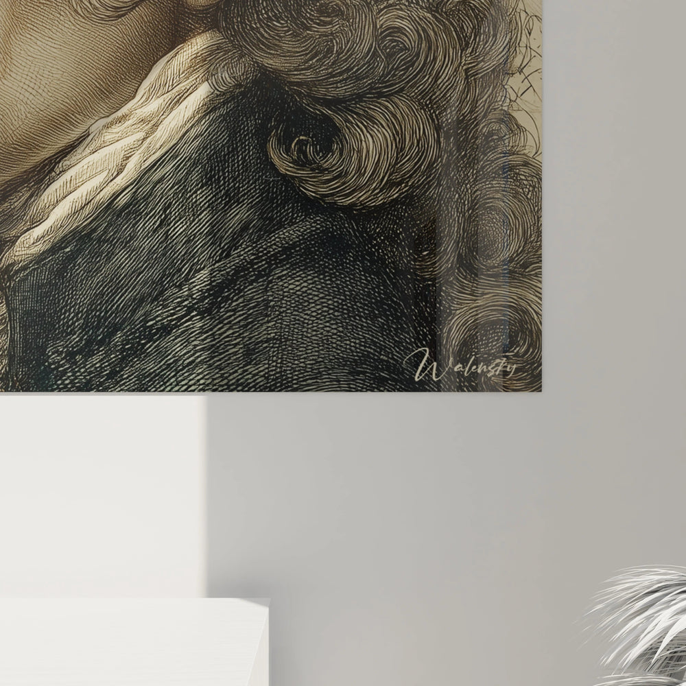 La composition de cette œuvre révèle un équilibre parfait entre le sujet principal et les éléments décoratifs environnants. Le portrait occupe les trois quarts de l'espace, positionné légèrement vers la gauche pour créer une dynamique visuelle captivante. Les lignes directrices suivent naturellement les courbes de la perruque volumineuse, guidant l'œil vers le visage expressif du personnage. L'arrière-plan manuscrit apporte une profondeur historique sans concurrencer le sujet principal. Cette art mural portrait sophistiqué utilise la perspective classique du portrait de trois-quarts, technique privilégiée pour révéler à la fois la noblesse des traits et l'expression du regard. Les proportions respectent les canons esthétiques de l'époque, créant une harmonie visuelle parfaite.
