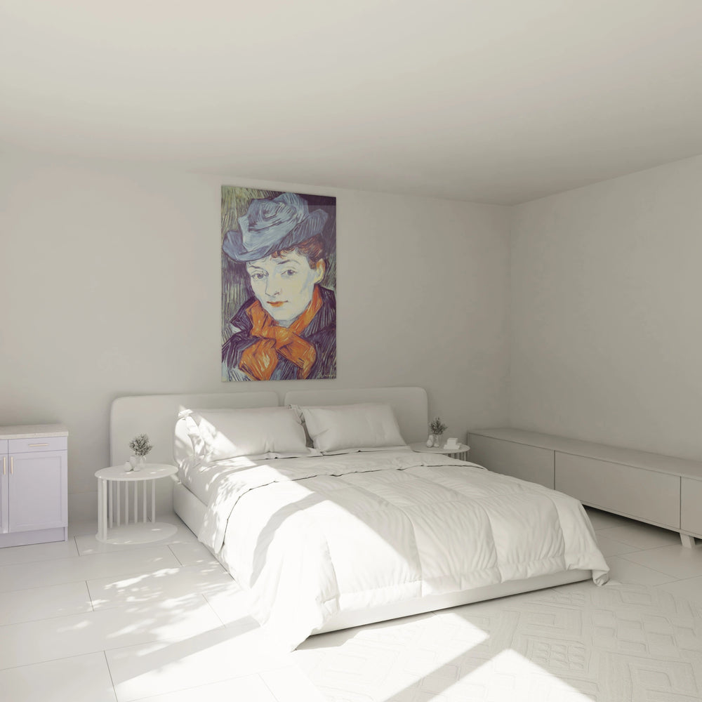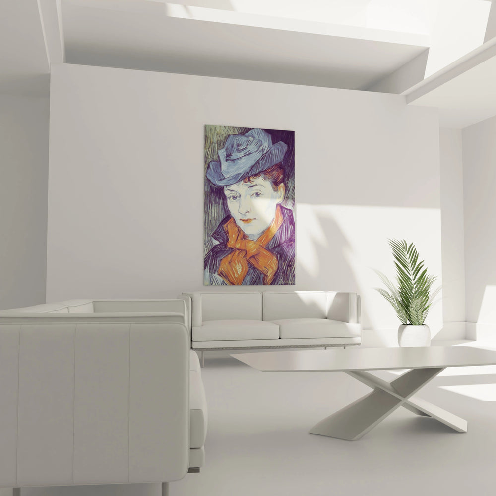 Ce tableau portrait chapeau bleu unique se distingue par plusieurs éléments distinctifs remarquables. L'expression mélancolique du personnage, captée avec une justesse psychologique saisissante, constitue l'âme de l'œuvre. La technique post-impressionniste visible dans chaque détail révèle une approche moderne de l'art du portrait. Cette décoration murale portrait expressif possède une signature visuelle immédiatement reconnaissable : l'alliance entre la rigueur compositionnelle et la liberté gestuelle. Les nuances chromatiques subtiles du visage, obtenues par des glacis et des empâtements savamment dosés, créent une profondeur émotionnelle rare.