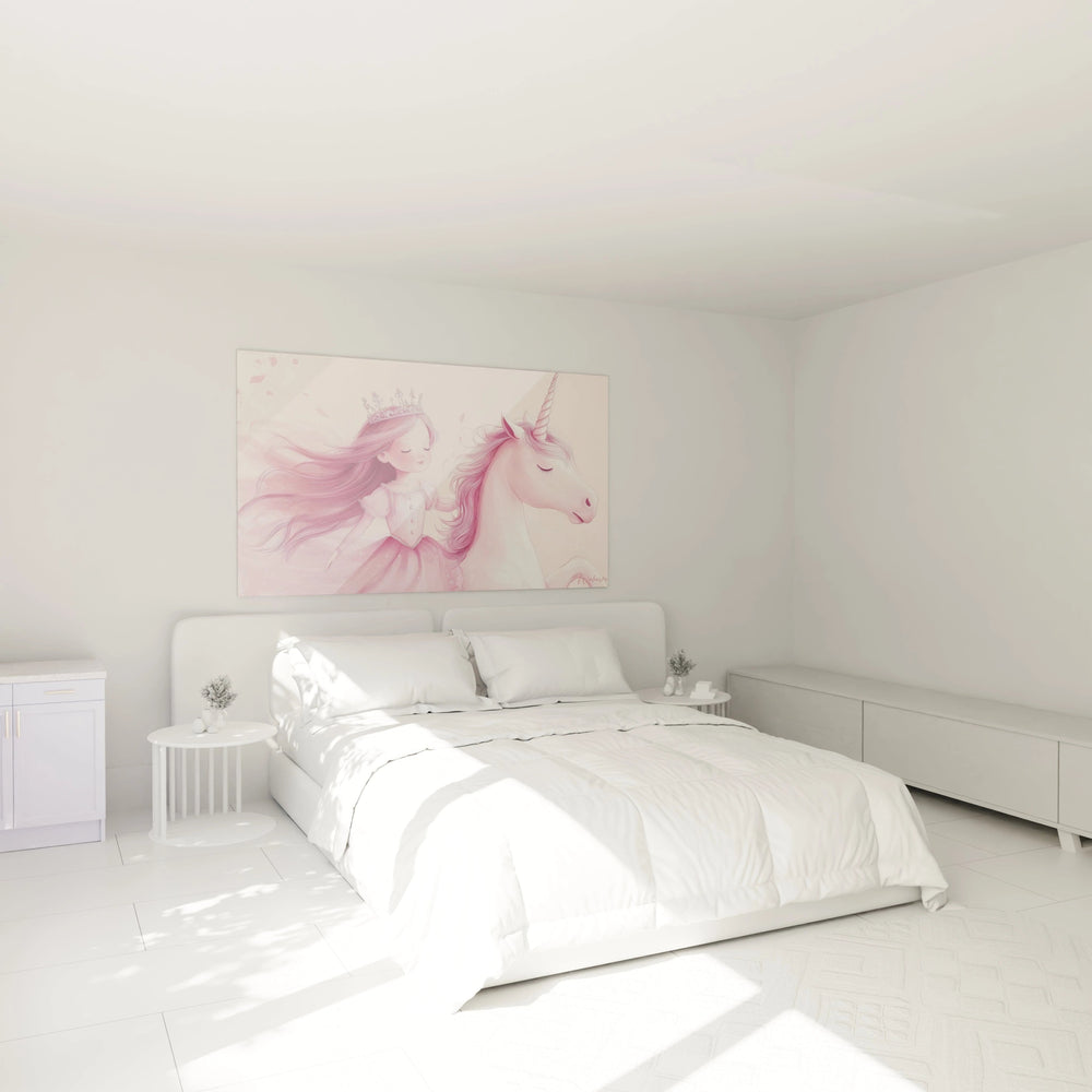 Ce tableau Ă©voque une jeune princesse majestueuse, accompagnĂ©e de sa licorne immaculĂ©e, symbole de puretĂ© et de magie. La posture sereine de la princesse et la douceur des traits illustratifs crĂ©ent un havre de paix oĂč chaque regard se perd dans un monde enchanteur. Les teintes pastels lumineuses, mĂȘlĂ©es Ă des touches dâor rose, tissent une ambiance aĂ©rienne et prĂ©cieuse qui fascine par sa dĂ©licatesse.