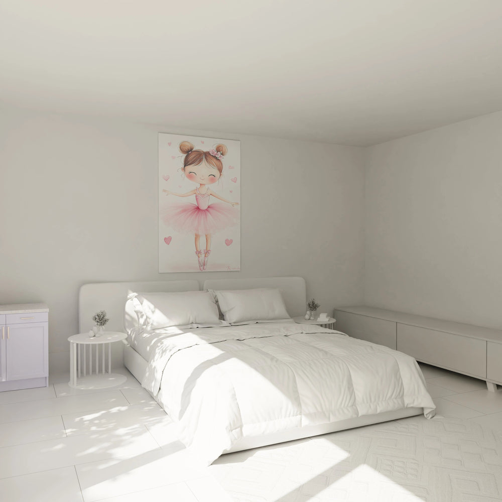 Ce tableau capture la silhouette lĂ©gĂšre dâune ballerine dĂ©licatement coiffĂ©e, qui semble danser avec une infinie douceur sous un ciel parsemĂ© de petits cĆurs. Son tutu vaporeux, teintĂ© de rose poudrĂ© et caressĂ© par des touches dorĂ©es subtiles, rappelle la transparence des tulles et la lĂ©gĂšretĂ© aĂ©rienne dâun rĂȘve Ă©veillĂ©. La scĂšne Ă©voque tant de choses Ă la fois : la tendresse dâun moment paisible, la magie dâun ballet intemporel et la douceur dâun conte racontĂ© au creux dâune nuit Ă©toilĂ©e.