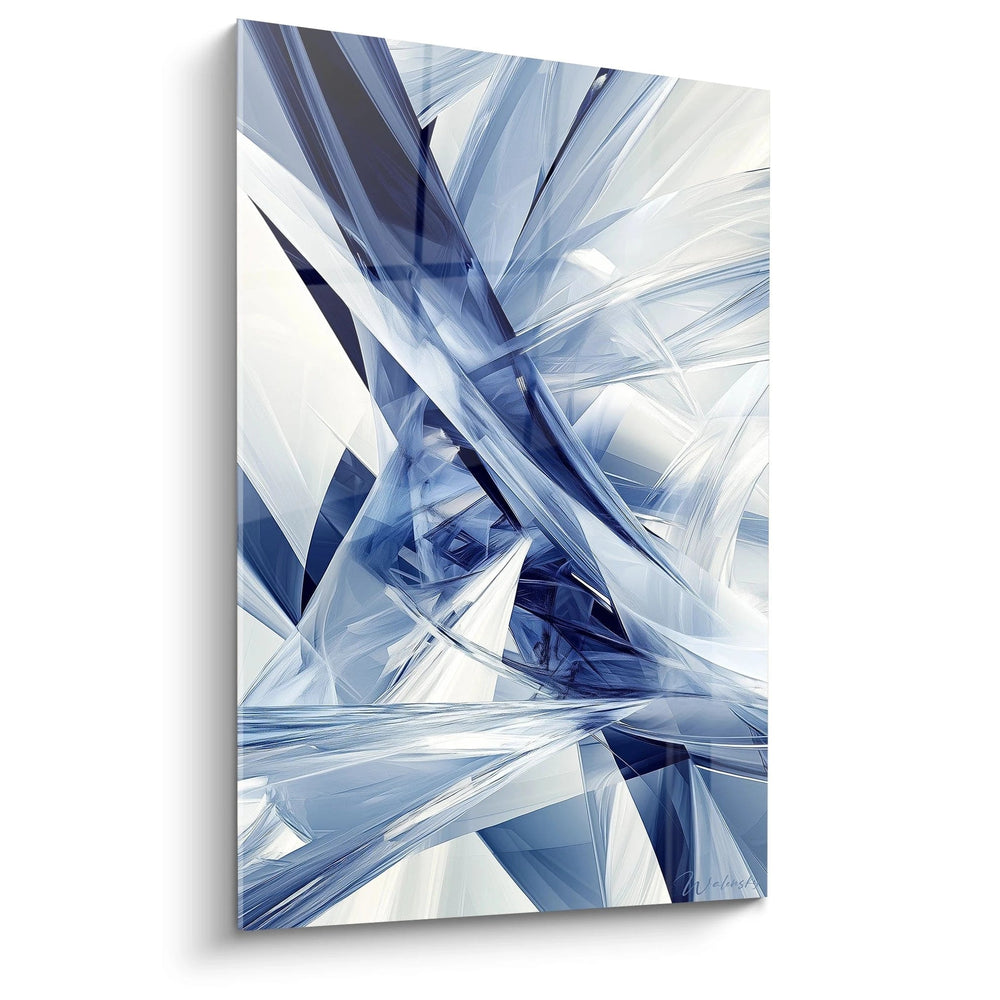 La palette chromatique de ce tableau abstrait bleu et blanc s'articule autour d'une gamme sophistiquée de bleus allant du cobalt profond au bleu glacier translucide. Ces nuances sont magnifiquement contrebalancées par des blancs purs et des gris perle qui apportent luminosité et contraste. L'harmonie coloriste crée une atmosphère apaisante tout en conservant un dynamisme visuel constant. Les variations tonales du tableau géométrique bleu moderne évoquent simultanément la glace, le cristal et le métal poli, offrant une richesse d'interprétations qui évolue selon l'éclairage ambiant.