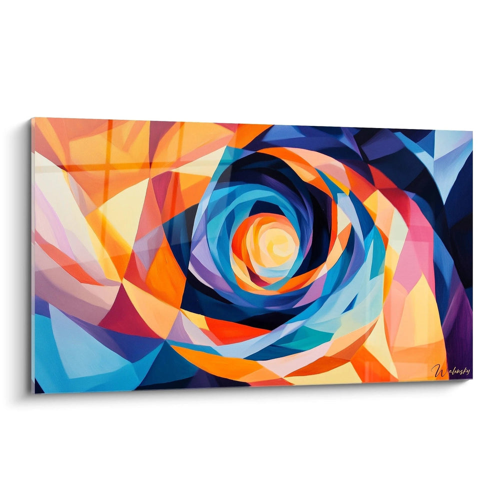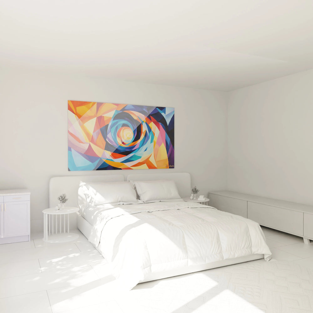 Au premier regard, vous êtes happé par cette spirale envoûtante. Les formes géométriques fragmentées s’entrelacent avec une harmonie précise, évoquant à la fois la rigueur et la fluidité. Cette pièce est bien plus qu’un simple tableau : c’est une expérience immersive qui capte la lumière selon l’angle, révélant une profondeur vibrante et des nuances riches qui semblent danser sous vos yeux.