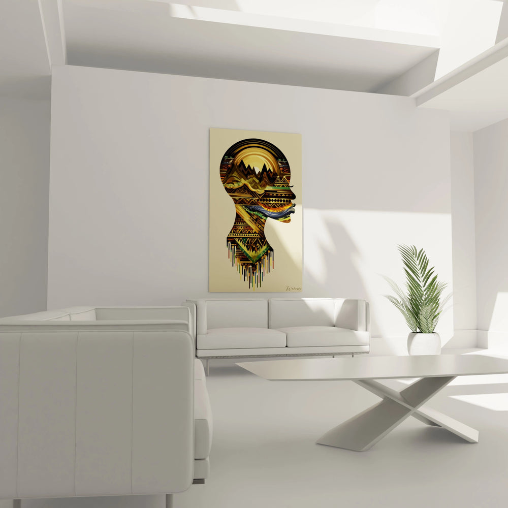 Cette œuvre d'art captivante présente un tableau profil tribal d'une richesse visuelle exceptionnelle. Le sujet principal, une silhouette humaine de profil, se transforme en véritable toile de motifs géométriques traditionnels. Ce tableau profil spirituel géométrique frappe immédiatement par sa composition verticale élégante et ses couleurs chaleureuses qui évoquent les terres ancestrales. L'élément le plus distinctif réside dans la superposition harmonieuse de paysages naturels intégrés aux motifs tribaux, créant une fusion unique entre l'humain et la nature. Les premières secondes d'observation révèlent la complexité de cette décoration murale profil ethnique qui invite à une contemplation prolongée.