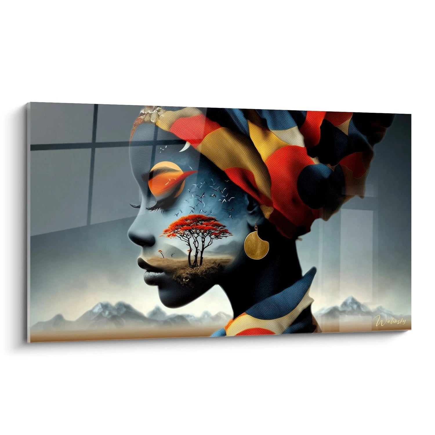 L'unicité de cette décoration murale africaine réside dans sa capacité à fusionner portrait et paysage de manière organique. L'arbre rouge qui pousse littéralement dans l'espace facial constitue un élément distinctif impossible à reproduire. Le vol d'oiseaux qui traverse l'espace interne ajoute une dimension temporelle unique. Cette art mural portrait se distingue par sa boucle d'oreille dorée qui ancre la figure dans la réalité, créant un pont entre le monde tangible et l'univers onirique. Les détails comme les cils délicatement dessinés et la précision du turban multicolore témoignent d'une maîtrise artistique exceptionnelle.