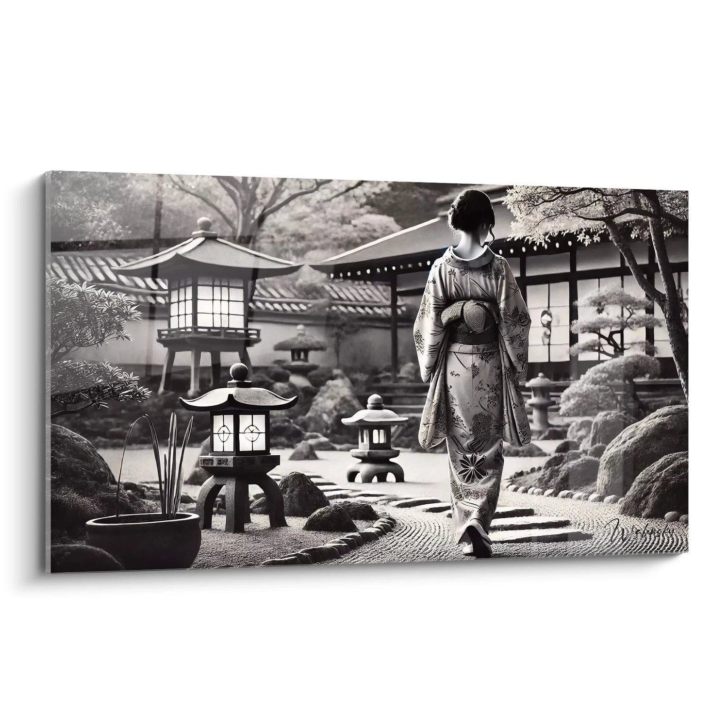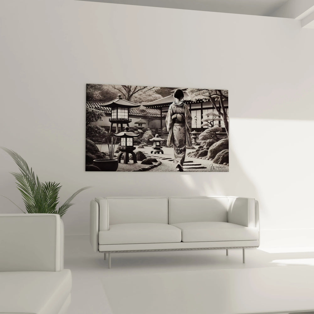 Ce tableau capte l’essence même de la quiétude d’un jardin japonais, un lieu où le temps semble suspendu. Les jeux d’ombres et de lumières sculptent avec finesse la silhouette d’une femme en kimono, avançant avec lenteur sur un chemin de pierres, entourée de lanternes délicates et d’un pavillon discret. Cette scène, d’une pure élégance, vous transporte instantanément dans un univers de calme et d’harmonie, un havre de paix au cœur de votre intérieur.