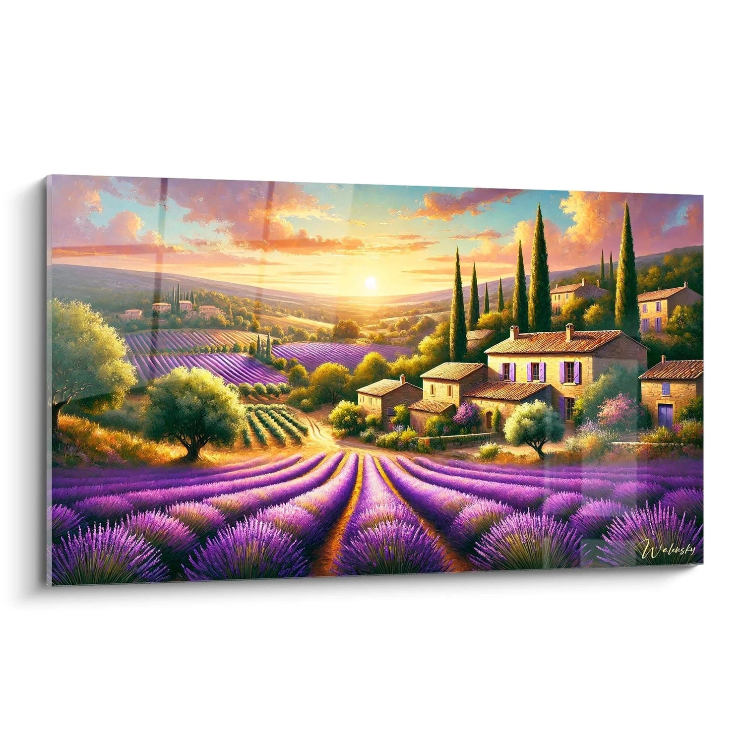 Chaque regard posé sur cette œuvre vous transporte immédiatement dans un univers où la nature s’exprime dans sa beauté la plus pure. Les riches nuances de violet des lavandes se marient aux tons chauds orangés du ciel crépusculaire, tandis que les verts olivâtres des cyprès apportent une touche apaisante. Vous sentez presque le parfum délicat des fleurs, cette douceur qui enveloppe l’air et apaise l’esprit.