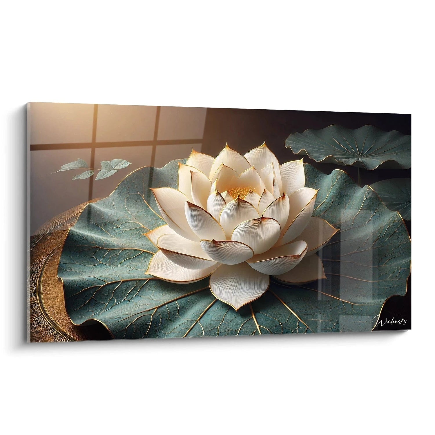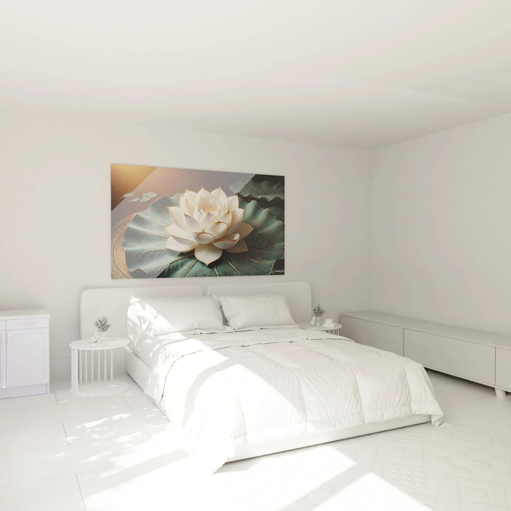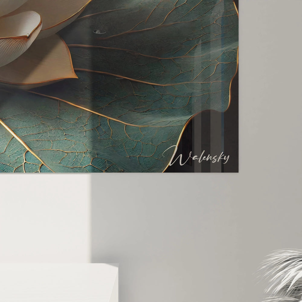 Chaque détail de cette œuvre est pensé pour vous transporter vers une sensation profonde de paix intérieure et d’harmonie. Les feuilles vertes luxuriantes, aux textures soignées, contrastent délicatement avec les pétales lumineux que traversent de subtils reflets dorés, symboles d’une lumière intérieure précieuse et bienveillante. Vous ne verrez plus votre intérieur de la même façon : ce tableau deviendra le foyer d’une énergie apaisante et revitalisante.