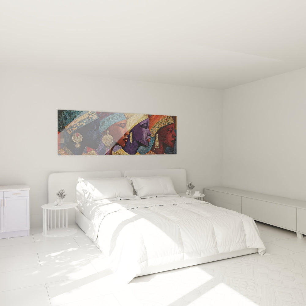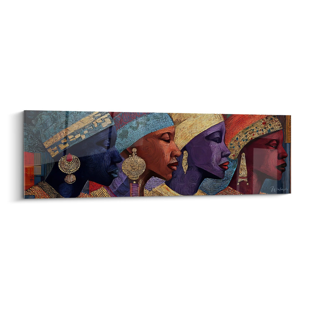 Ce tableau mural femmes africaines présente une composition saisissante de quatre portraits féminins disposés en panorama horizontal. Chaque visage africain est magnifiquement orné de bijoux traditionnels dorés, créant un ensemble harmonieux qui célèbre la beauté et l'élégance de la culture africaine. Les portraits de femmes africaines se distinguent par leurs coiffures élaborées et leurs parures sophistiquées, notamment des boucles d'oreilles pendantes et des ornements de tête finement ciselés. Cette œuvre d'art africain contemporain capture l'essence de la dignité féminine à travers des profils nobles et expressifs. Le tableau décoratif africain révèle un travail artistique minutieux où chaque détail des bijoux et des coiffures témoigne d'un savoir-faire ancestral. Les visages, tournés de profil, créent un rythme visuel captivant qui invite à la contemplation. Cette peinture murale ethnique s'impose comme une pièce maîtresse pour sublimer tout intérieur moderne tout en rendant hommage aux traditions séculaires africaines.