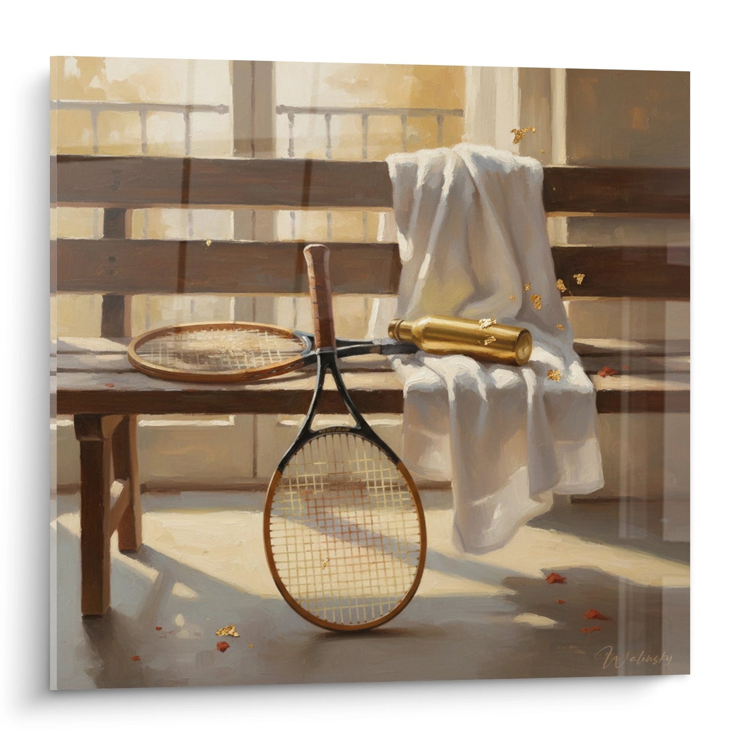 Cette magnifique œuvre capture l'essence intemporelle du tennis à travers une composition soigneusement orchestrée. Sur un banc en bois baigné de lumière dorée, deux raquettes de tennis vintage aux cadres en bois naturel se dressent fièrement, accompagnées d'un élégant tube de balles doré. Le drapé blanc immaculé apporte une touche de douceur et d'élégance à cette scène nostalgique. L'arrière-plan révèle une architecture classique avec des colonnes et des balustrades, évoquant les clubs de tennis prestigieux d'antan. Les jeux d'ombres et de lumières créent une atmosphère contemplative, où chaque détail raconte l'histoire du tennis traditionnel. Cette nature morte tennis vintage transformera votre espace en véritable hommage à ce sport noble, parfait pour les amateurs de tennis et les collectionneurs d'art sportif.