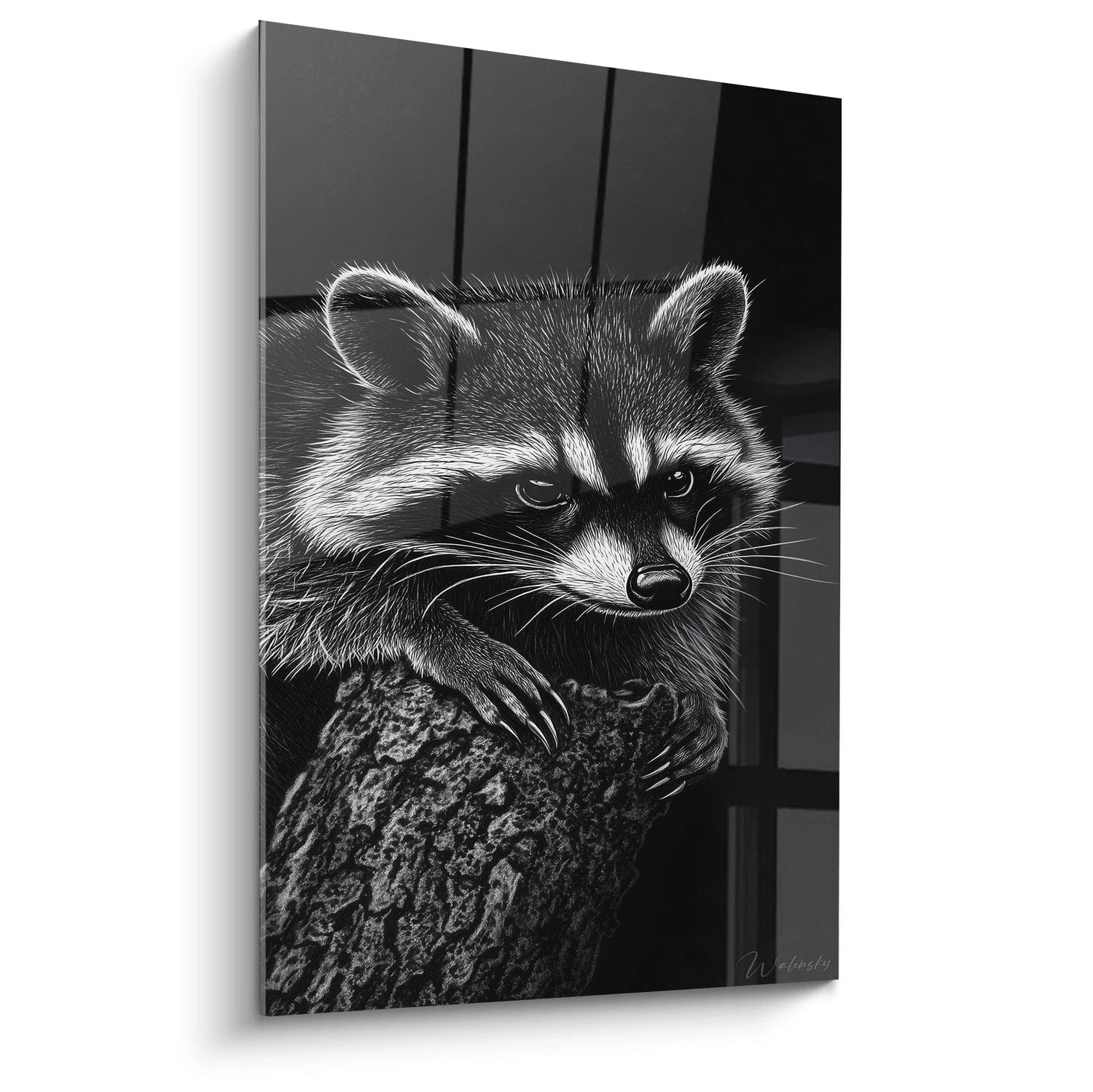 Cette art mural raton laveur portrait se distingue par plusieurs éléments visuels remarquables qui en font une pièce véritablement unique. L'expression faciale du raton laveur transcende la simple représentation animalière pour atteindre une dimension presque humaine, évoquant curiosité et intelligence. La position des pattes avant, délicatement posées sur la branche, ajoute une gestuelle naturelle et vivante à l'ensemble. Le traitement du masque facial noir caractéristique de l'espèce devient ici un élément graphique puissant qui structure visuellement l'œuvre. La finesse du rendu des moustaches, véritables fils de lumière sur fond sombre, témoigne d'un niveau de détail exceptionnel qui différencie cette œuvre raton laveur monochrome des représentations classiques.