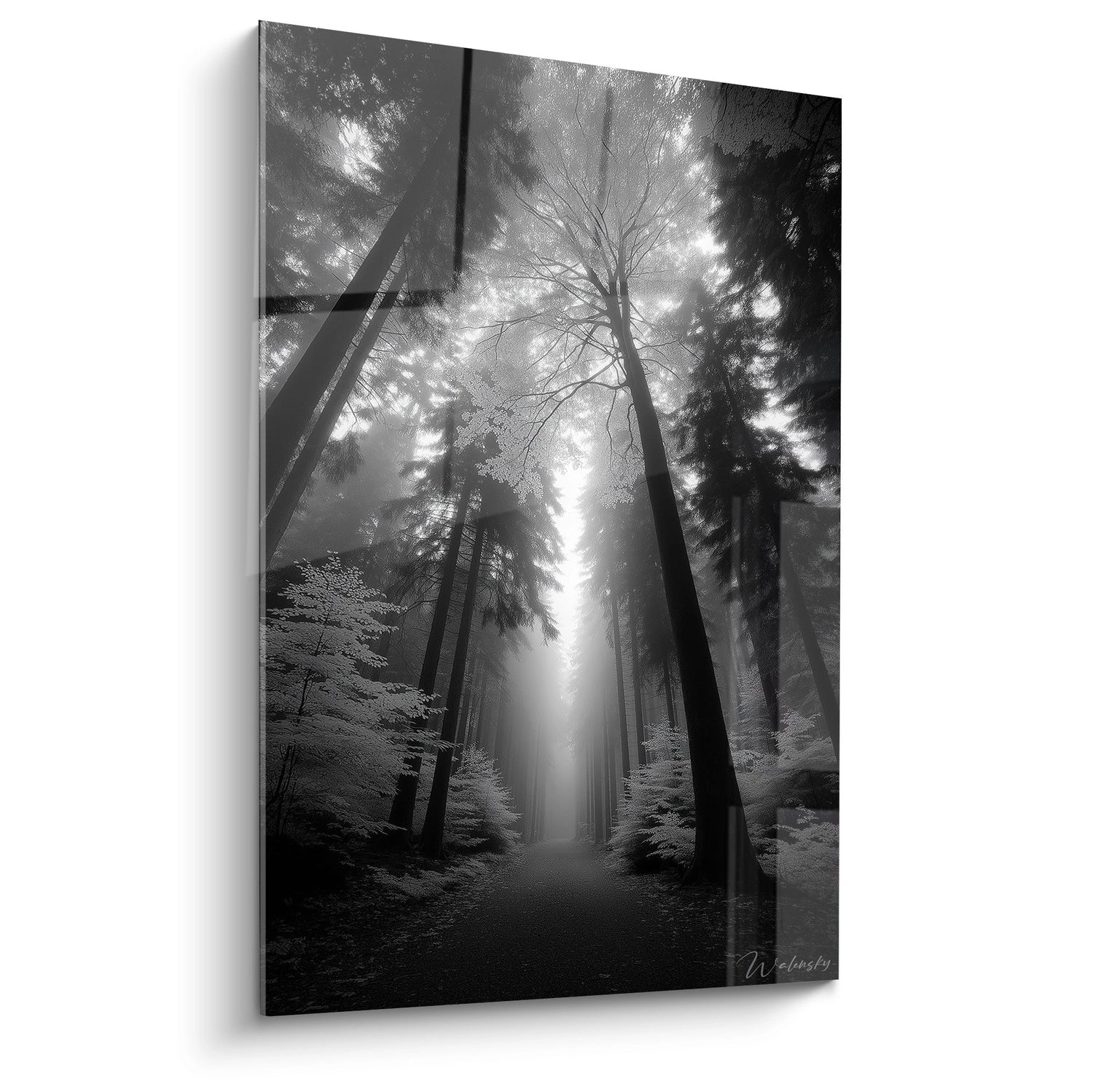 La palette monochrome de ce tableau artistique forêt amplifie la dimension spirituelle de la scène. Les nuances de gris créent une harmonie apaisante, tandis que le contraste saisissant entre les zones d'ombre et de lumière symbolise l'espoir perçant l'obscurité. Cette œuvre d'art murale nature évoque la renaissance, la guidance divine et la connexion profonde avec la nature sauvage.