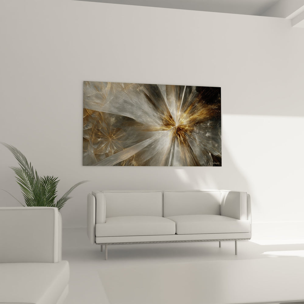 Tags : rayons lumineux dorés, art abstrait géométrique, décoration moderne luxe, explosion stellaire, tableau contemporain salon