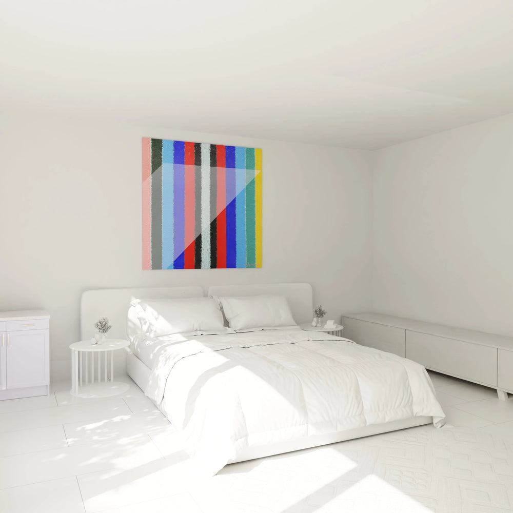 Ce tableau rayures présente une composition géométrique saisissante de bandes verticales colorées qui capturent immédiatement l'attention. L'œuvre révèle un alignement parfait de rayures aux couleurs vives : rouge éclatant, bleu profond, vert émeraude, blanc pur, noir intense et jaune lumineux. Chaque bande possède une texture particulière avec des bords légèrement irréguliers qui créent une sensation de mouvement. Ce tableau rayures multicolores génère une expérience visuelle dynamique où les contrastes chromatiques créent des vibrations optiques subtiles. La régularité du motif géométrique confère à cette décoration murale rayures une force visuelle remarquable qui transforme instantanément l'espace environnant.