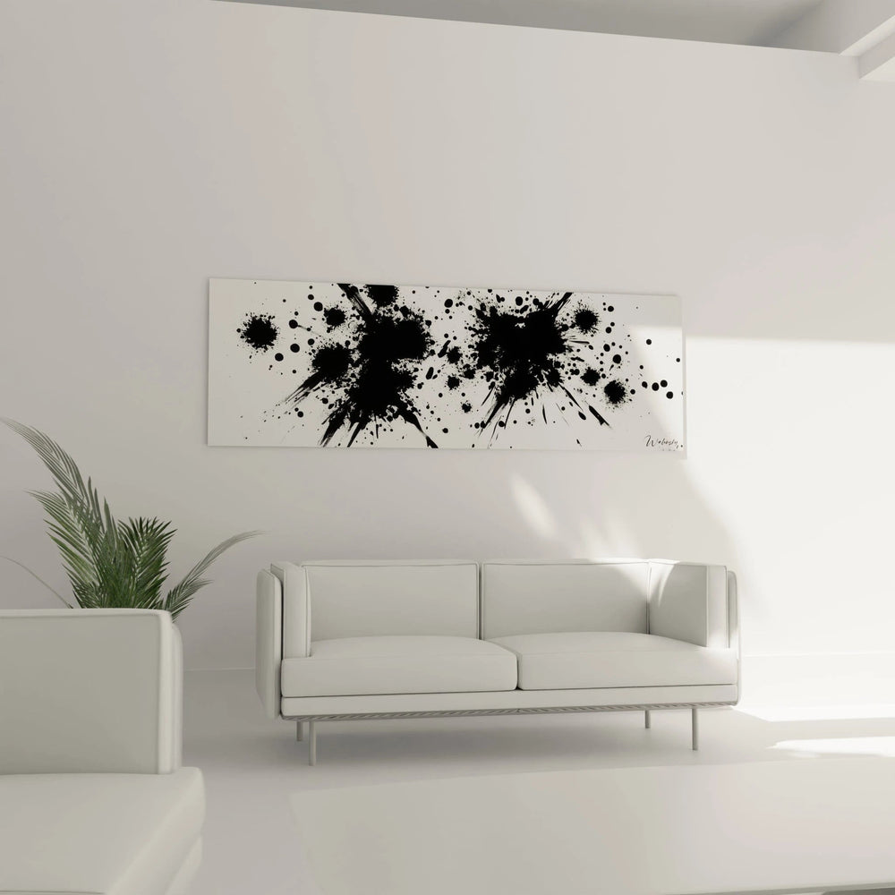 Ce tableau éclaboussures présente une composition abstraite saisissante où la spontanéité créative s'exprime à travers des projections d'encre noire sur un fond blanc immaculé. L'œuvre révèle immédiatement son caractère expressif et dynamique, captivant l'observateur par son tableau éclaboussures noir intense. Les gouttes et traces d'encre semblent figées dans un mouvement perpétuel, créant une tension visuelle palpable. Cette décoration murale éclaboussures moderne évoque la liberté créative absolue et l'expression pure de l'émotion artistique. La signature discrète en bas à droite confirme l'authenticité de cette création contemporaine remarquable.