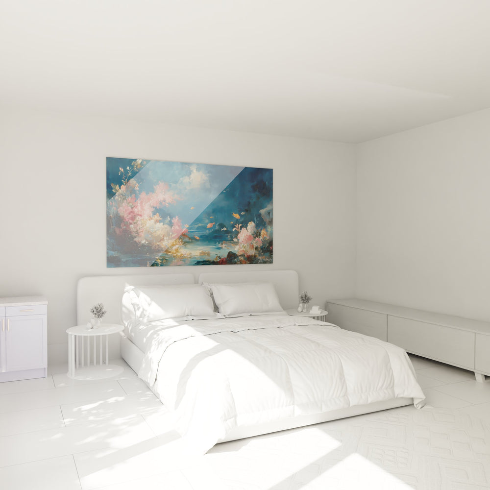 Ce magnifique tableau mural récif corallien présente une vision artistique et poétique des fonds marins tropicaux. L'œuvre dépeint un véritable jardin sous-marin où s'épanouissent des coraux aux teintes roses et blanches, créant un paysage aquatique d'une beauté saisissante. La technique picturale employée évoque l'impressionnisme, avec des touches de pinceau fluides qui donnent vie à cet écosystème marin coloré. Les poissons tropicaux dorés évoluent gracieusement entre les formations coralliennes, apportant une dimension dynamique à cette composition sous-marine artistique. L'eau translucide, rendue par des nuances de bleu profond et turquoise, crée une atmosphère mystérieuse et apaisante. Cette peinture de récif corallien capture l'essence même de la biodiversité marine, transformant un simple mur en fenêtre ouverte sur les merveilles des océans. L'artiste a su reproduire avec finesse les jeux de lumière sous-marine, créant des reflets nacrés sur les surfaces coralliennes. Cette œuvre d'art fonds marins invite à la contemplation et au voyage imaginaire dans les profondeurs océaniques.
