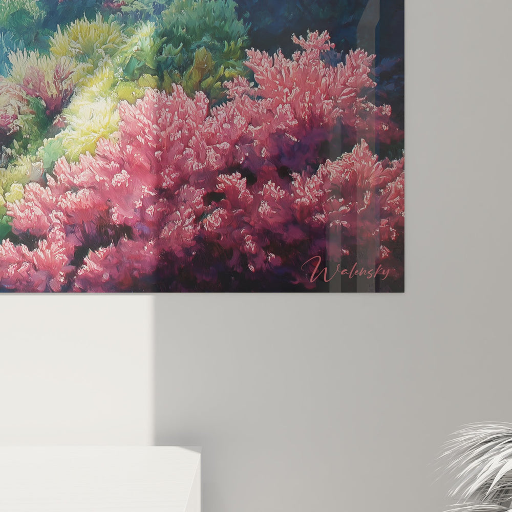 La palette chromatique de ce tableau art océanique moderne symbolise la renaissance et la résilience de la nature. Les tons roses et violets des coraux évoquent la vitalité et la passion, tandis que les verts représentent la croissance et l'harmonie. Le bleu turquoise de l'eau symbolise la tranquillité et l'infini, créant une ambiance apaisante parfaite pour une décoration intérieure marine contemporaine.
